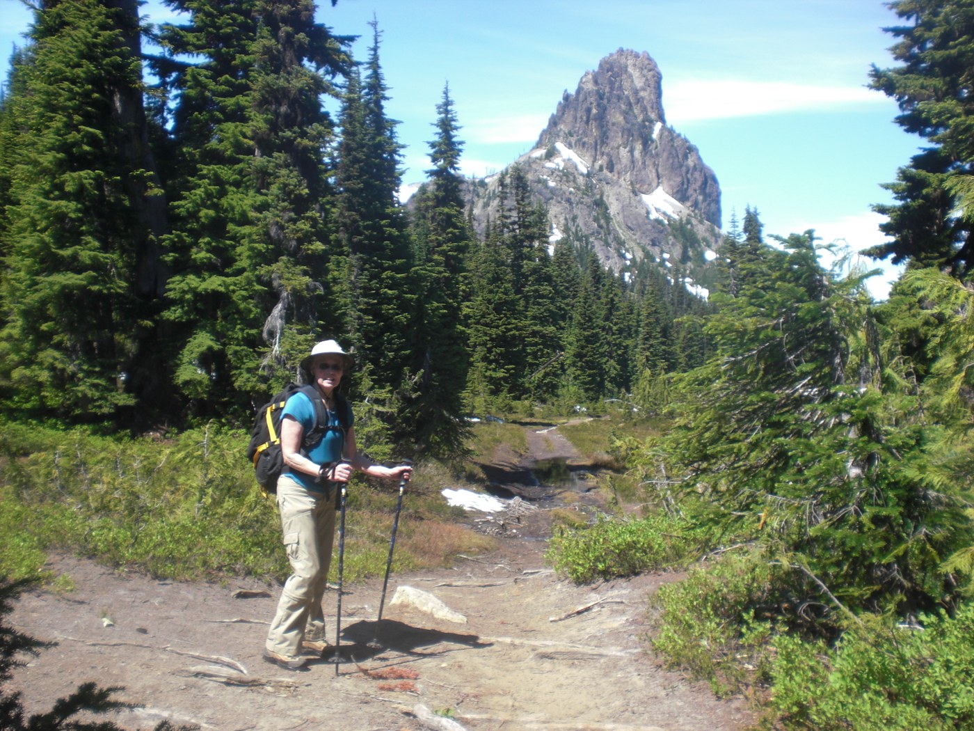 Hike up in forest to an intersection at two miles in; go right for peaceful Squaw Lake and to Cathedral Rock/Pass. There was a lot of blowdown, but we saw a crew starting to work on the trail as we were headed out. One section of blowdown takes a bit of work to get over. After the lake, you have several stream crossing none of which required getting wet. It was muddy around the melting snow patches through that section. You break out to lovely meadows and tarns. At 4.5 miles you will be at the pass just below Cathedral Rock. There are several roaming possibilities as the Pacific Crest Trail and trail to Peggy's Pond intersect in this area. There was lots of water available along this section of the trail, and the bugs weren't bad. The road (4330) was pretty full of ruts and potholes so you need to drive slow. The Scatter Creek ford is currently about a foot deep so a high clearance vehicle is highly recommended.