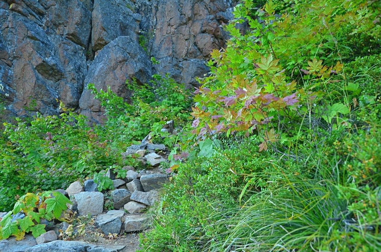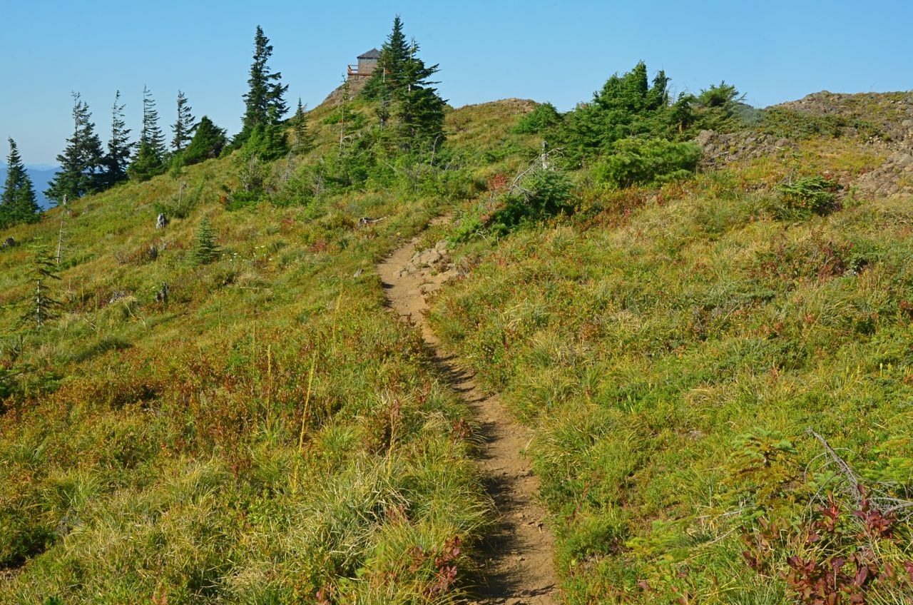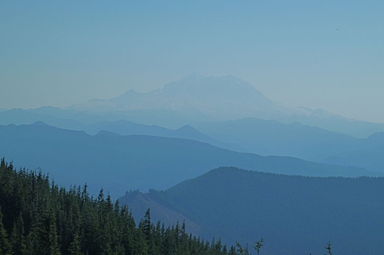 Directions to the TH are accurate in the Hiking Guide. We parked at the TH sign. The road can be driven to the actual trail, but there is no turn around if you meet another vehicle. We did drive the road after our hike to check the mileage and our odometer said it was 0.7 mile. The new trail is steep but well done as always by WTA. Thank you! The only shade was the road walk. Views from the lookout were hazy but included Mt Rainier, Glacier Peak, Mt Baker, Mt Stuart, Mt Hinman, and Mt Daniel. We would like to have been on this trail when the beargrass was blooming. Morning lighting would be best for viewing Mt Rainier. We met one couple on our way up and 5 people on our way down. Fall colors are starting.