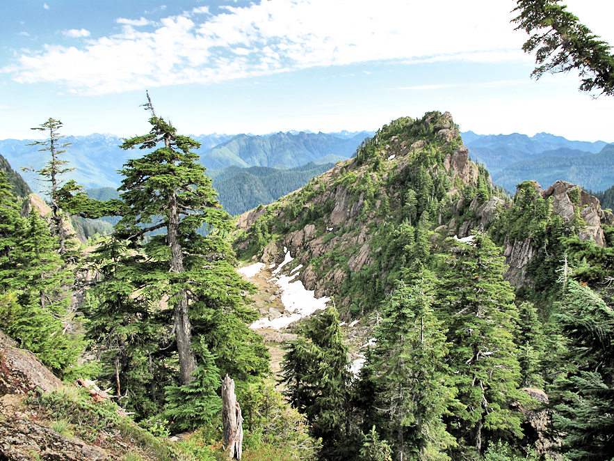 We hiked up the Pete's Creek Trail in the morning in absolutely beautiful weather. We managed to get beyond the exposed face of the slide area before full sun, which is why I like to start this hike early. We putzed around Moonshine Flats for a while before making our final press to the summit.