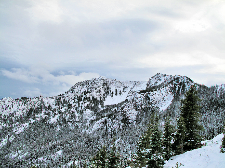 As I made my way down, the trail turns to where you can see up to the summit and… wait… is that blue sky? No sooner had I left than the sky immediately over the summit had cleared and the wind died down. Out to the west the sun broke through the clouds low over the range, illuminating the mountainside. The angle of the light seemed to amplify the contrast of the green fir trees and the white snow on their boughs; it was breathtaking! The rest of the hike down was uneventful and I arrived back at the parking area right at dusk.