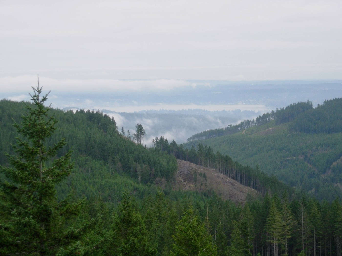 The view at the top was limited due to the weather. We could see Tahuya Lake and hints of the Olympics; we could see Bremerton, but the only evidence of downtown Seattle was the top of the Columbia Tower peaking through the clouds. We went back down the same way we came, along the Gold Creek Trail.