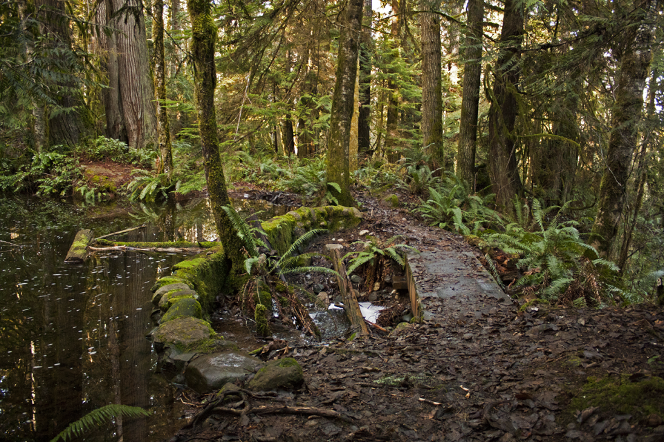 From the flat ridge top, on the descent you'll see the old Steam Donkey water pool with the stone dam controlling the flow. After that comes the old railbed where 1900's trains took the lumber down to the river/Hood Canal.