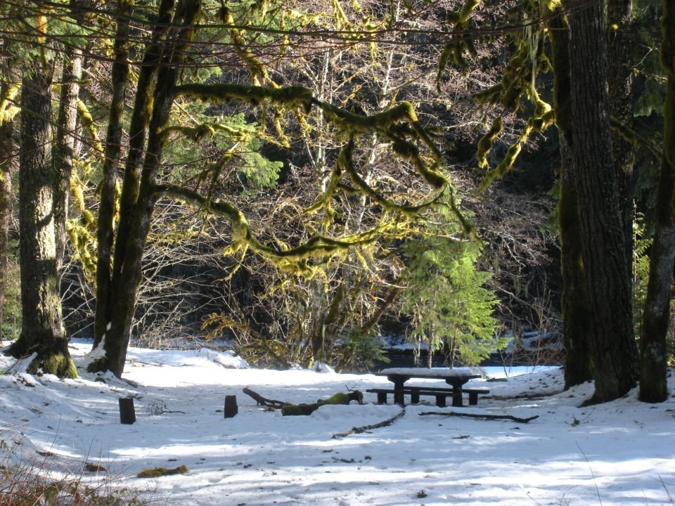 I was a little nervous about the snow on the road, even though there were two ruts without snow, my car has a pretty low suspension so we parked about a mile or two from the washout. It was an absolutely beautiful day for the hike. The route around the washout of the road is fairly steep up and down, but is very short. Then it's back to walking around a completely flat road. There was a track where people had gone before, but it was a bit icy sometimes, so it was often easier to walk to the side on the fresher snow. The campground itself is very beautiful - ran into a group that had overnighted the previous evening and said the stars were amazing. If you don't mind a bit of snow, this is a great hike right now.