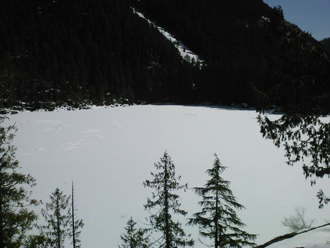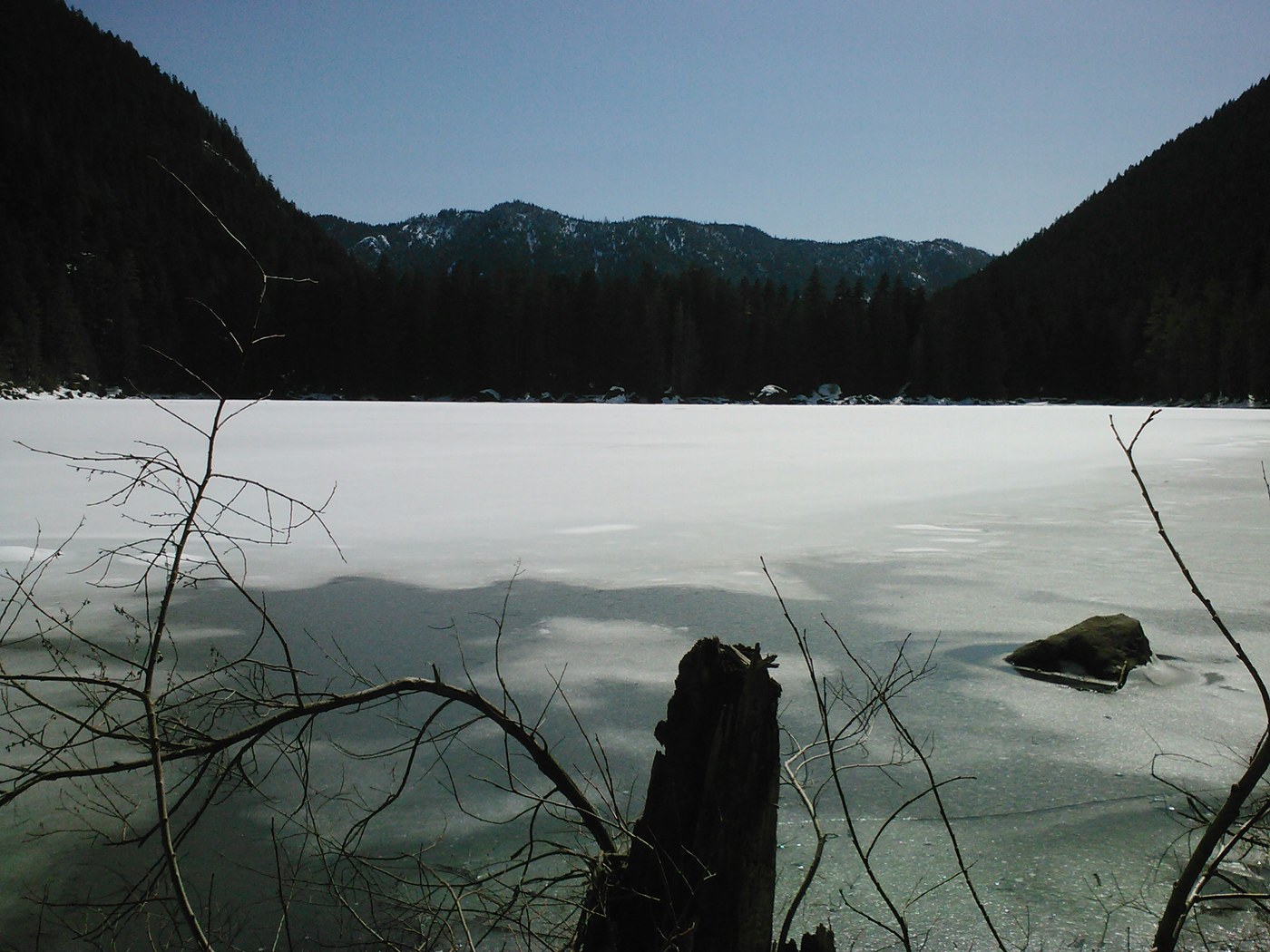 Beautiful day for this hike. Trail is clear until you hit the 15th switchback, then you start getting into snow. Two tree's down across trail, but both are an easy step over it, and keep going. The lake is still frozen over, but getting mushy near to shore. Saw some folks ice fishing, looked like fun!