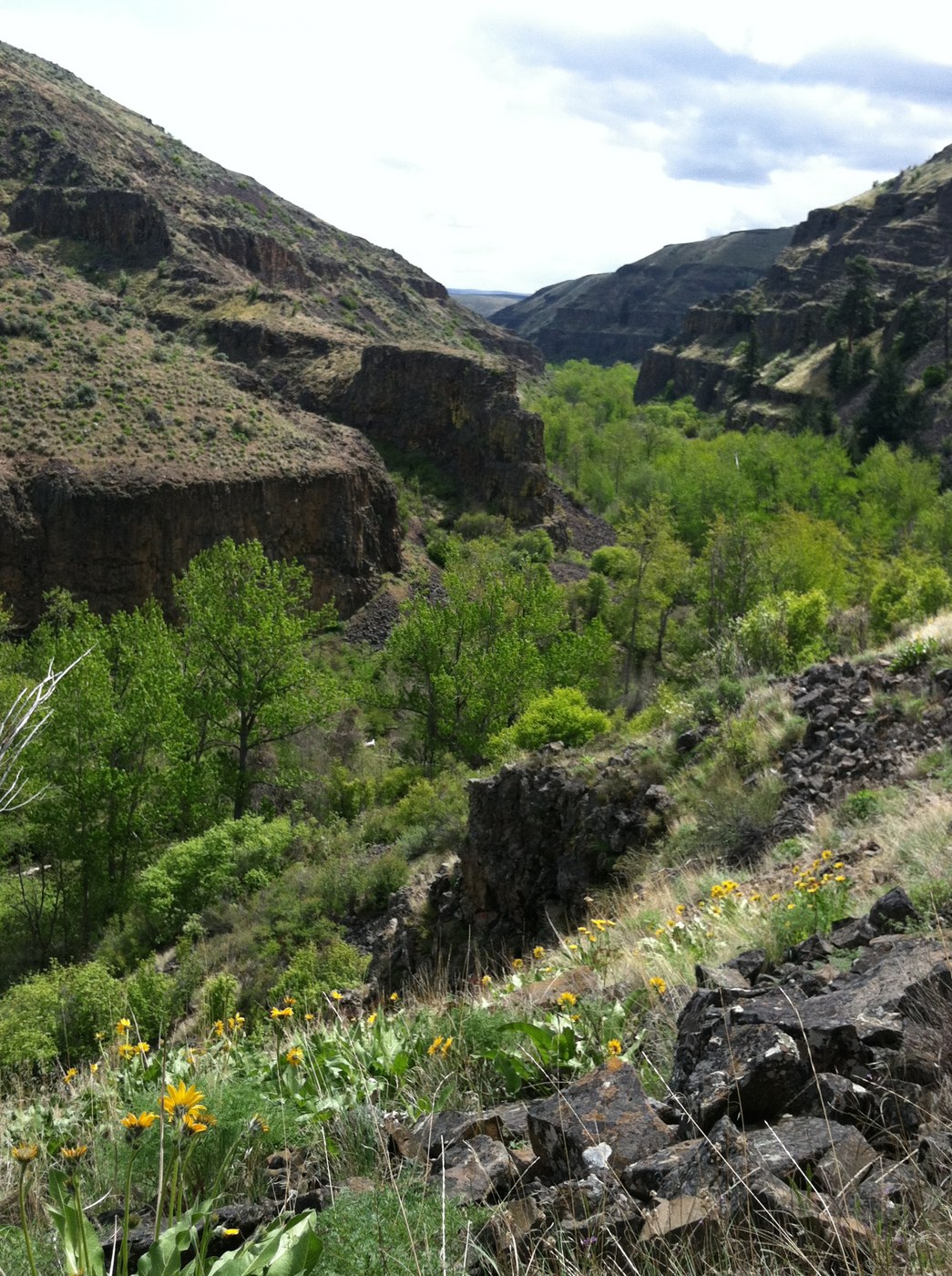 Thanks to whoever laid the log bridges over the two main creek crossings. We walked 2 hours into the canyon, past suddenly giant lone ponderosa pines and across four talus slopes, following several large cairns to where the trail petered out at a high vista. Just before, my pole missed a rock and went instead into a crevice, and the next sound I heard was an insistent rattle. Oops. Several ticks joined us for lunch. However, these inconveniences were rewarded by the incredible high views of light and shadow and rocky relief, including looking *down* on a splendid great blue heron on a long flight high up-canyon right towards us.