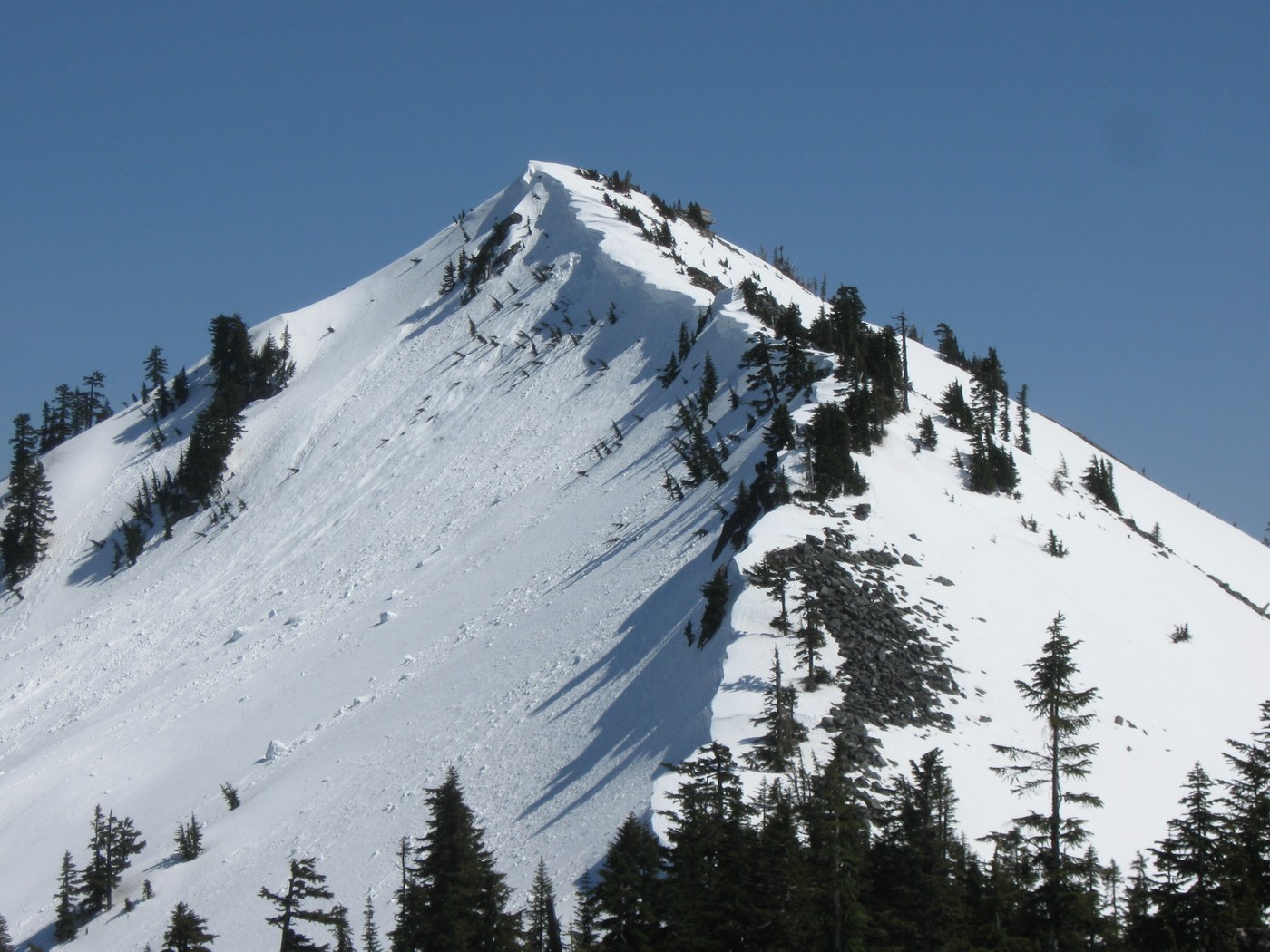 In hot weather like this weekend, I'd say the main avvy danger is during the descent, if you loiter on the summit until that SW slope starts to bake. I had decided that the safest descent would be on the westernmost of these two parallel ridges (not the rocky one that you see from I-90). This would avoid crossing from the eastern to the western ridge below the open slope above. But I have never actually done that descent route.