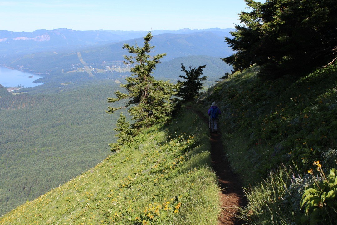 Took the very steepest route up. 50 deg., clear, and somewhat windy at the flower fields. Balsamroot past its prime (but still some nice specimens), larkspur the same, paintbrush lovely, lupine just coming on.