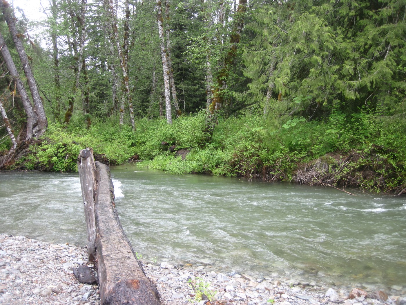 The East Fork Foss is running high and fast right now. I was there almost a year ago to the day (June 18, 2011 and June 17, 2012), and it was not difficult to cross the river at the big log. This year the water was up to the height of the bridge and a large pool was blocking the access to walking to it. I was able to make it with no water in my boot wearing my OR Gaiters and gortex boots and moving fast. My friend took of his shoes and socks and was thigh high in water. I have heard this called 5 mile camp. We were there in 90 minutes, not an unheard of pace for us in day packs.