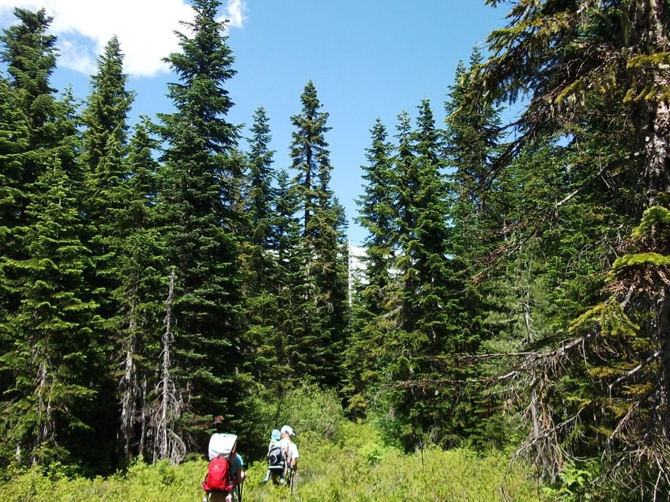 We then entered the forest and began a steady descent up for the next 2 miles or so. Though beautiful, we had unfortunately not prepared for the mosquitos. We found that we had to keep a pretty brisk pace in order to keep from being eaten. Still, it was beautiful and there were patches where views of the mountain would break through the trees. The smells were wonderful.