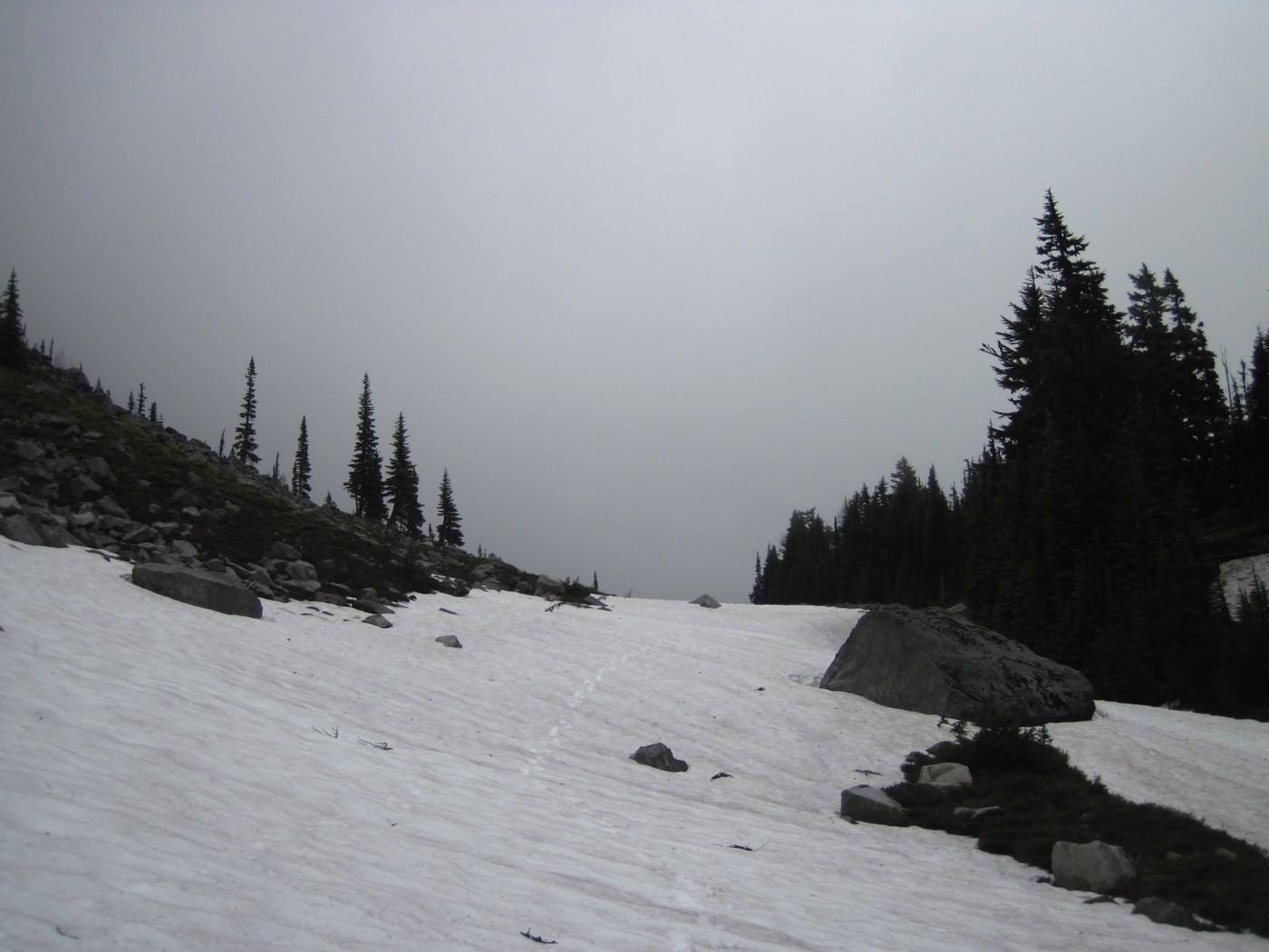 Well, I came back 4 weeks later. The blowdowns above Dick Creek have been cleared. The trail is snow free all the way to the Moraine Creek crossing. The lower part of Moraine Park has more snow than the upper. There were good boot tracks to follow. Once you hit the upper stretches of Moraine Park the snow is gone. There was hardly any snow on the trail above the park. The lake was beautiful. Saw tons of marmots in the park. I saw a big bear near the Mystic Lake Ranger Station. I calculated about 26 miles total from the Carbon River entrance and back. There were lots of berries along the old road.