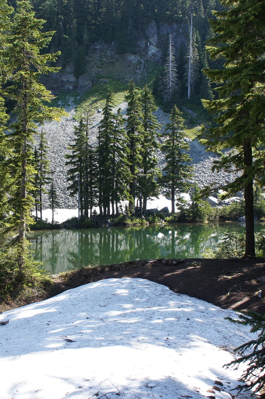 The hike down to Twin Lakes had even more blowdowns and more snow patches. We lost the trail for a little while but were able to pick it up again pretty quickly. There were some snow bridges that looked dangerous so we went around them.