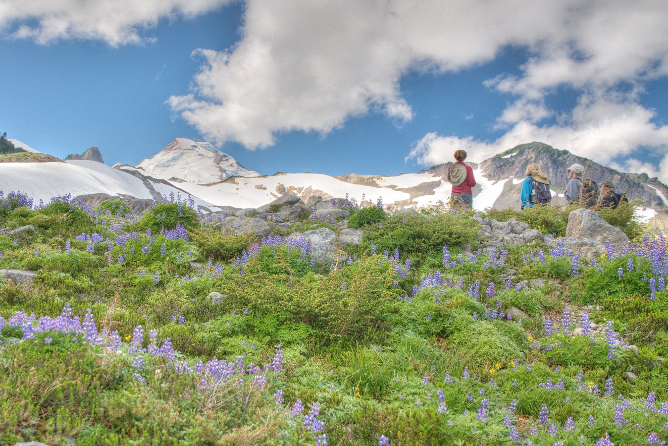 This should be on everyone's 'must hike' list. Miles of alpine ridge traverse set between Mt Shuksan and Koma Kulshan. The trail is in good shape, however there are some snowfield crossings and ascents that are much easier with trekking poles. I brought my ice axe, but didn't feel the need anywhere. A great day for photography, with sun mixed with swirling cumulus clouds. NO bugs.