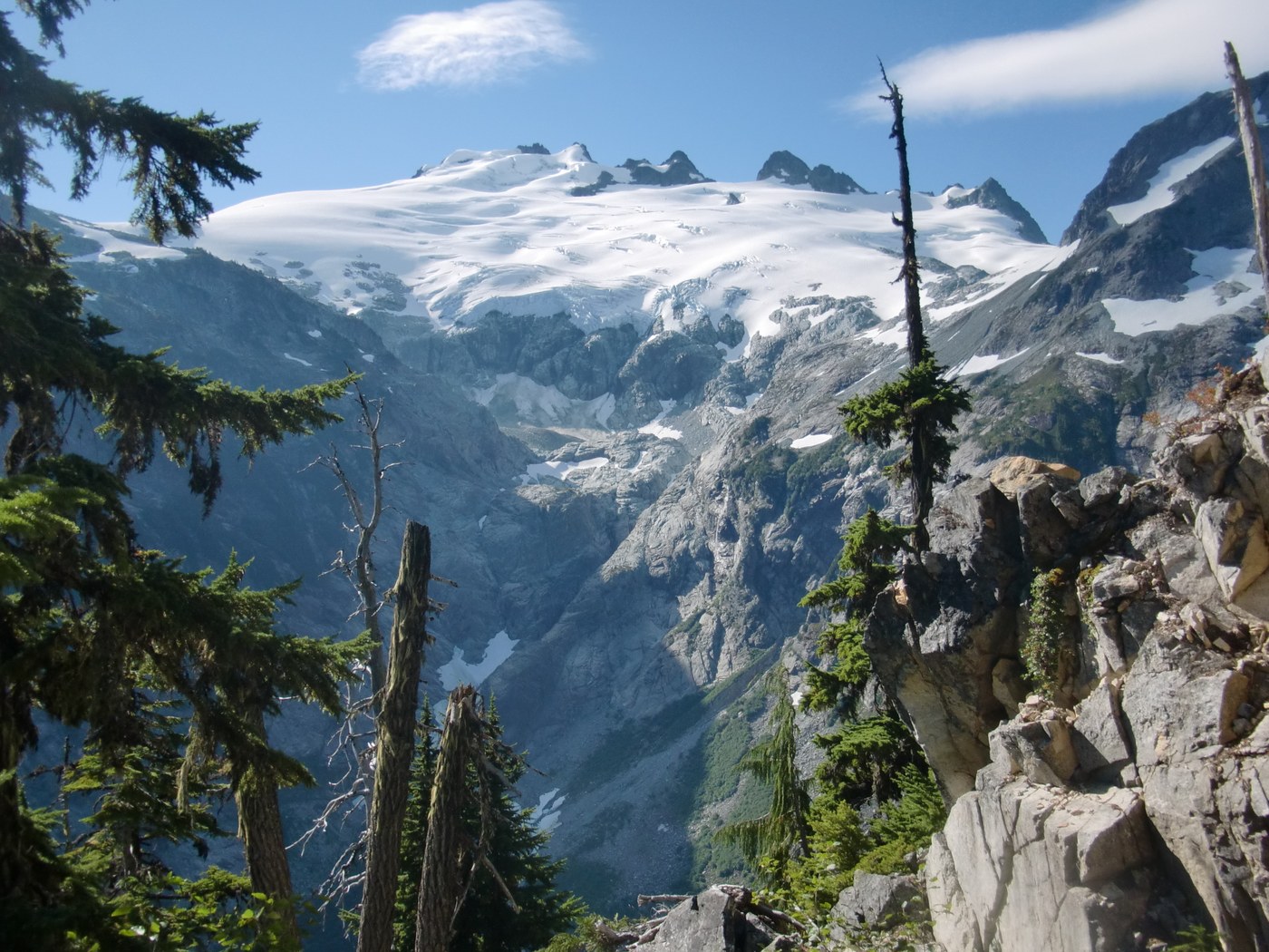 Once we started up the Whatcom Pass (Brush Creek) trail, the scenery just kept getting more spectacular until we reached the top, but it is a tough up-hill climb. A beautiful campsite with a view on top of the pass. And even better is the short hike south from the top of the pass, which gets you up close and personal to the immensity of Mt. Challenger and the Challenger Glacier.