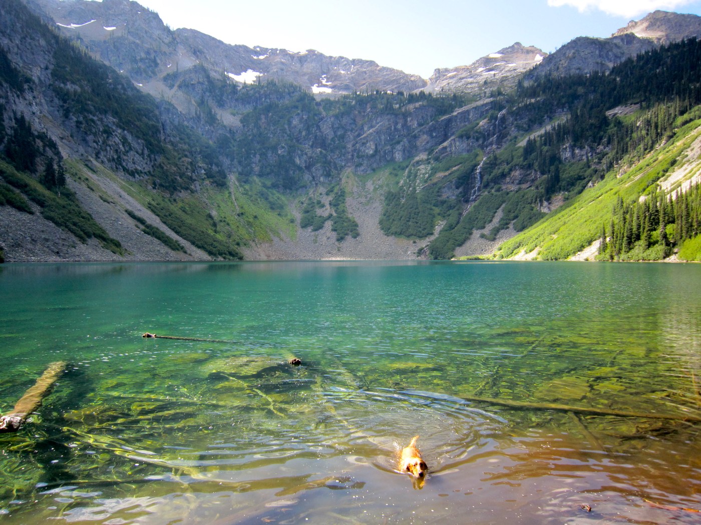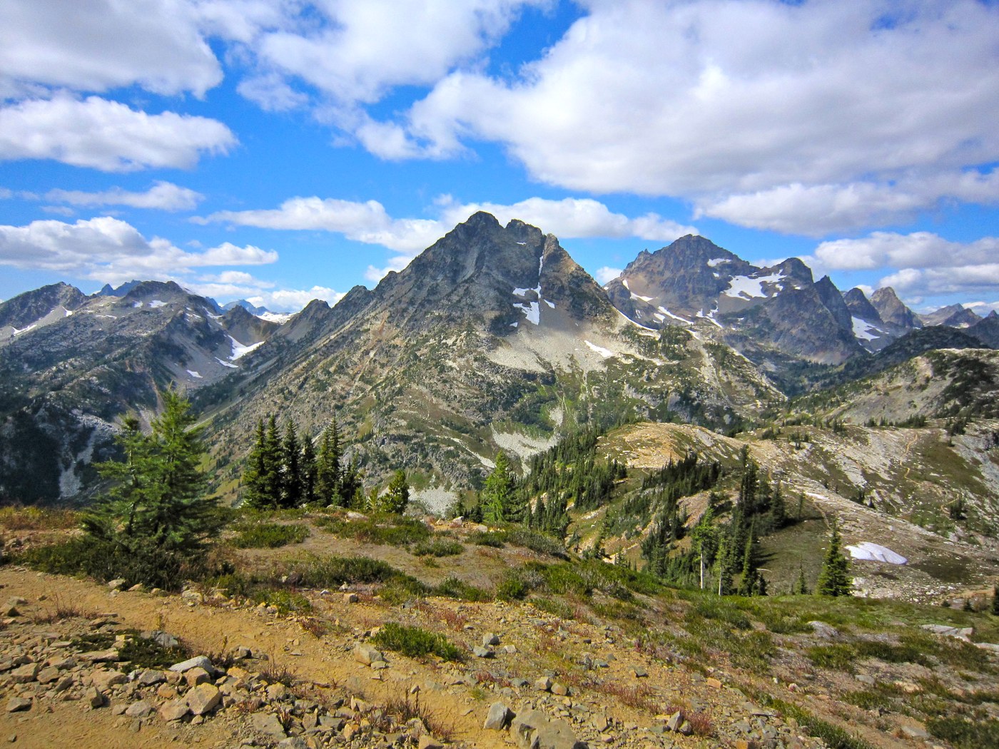 We went to Rainy Lake first so Scout could swim, then backtracked to the Maple Pass trail and head clockwise, doing the steeper section first. And we climbed! The views made stopping frequently worth it. After 20 minutes, I stripped off one shirt, after 40 minutes I drank a lot of water, and after an hour I need to eat! Bill got to the highest point, the spine saddle before Frisco Peak, and I met him and Scout for a short break, after about 3 hours of hiking, we’d done 4 miles total. Then the down began. Again, more spectacular views – Glacier Peak to the southwest was clear to the eye, not the camera.