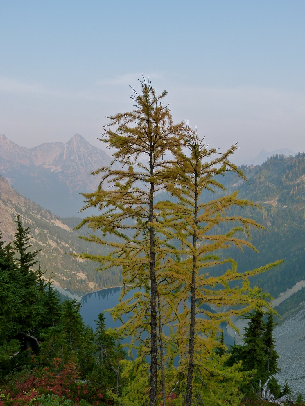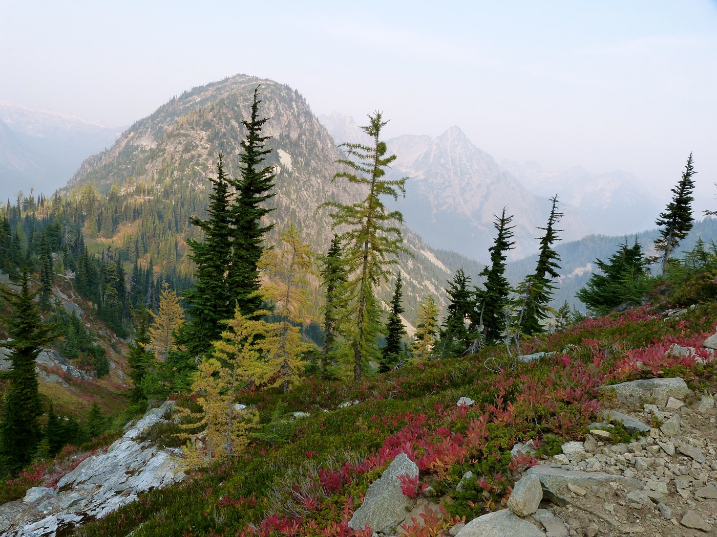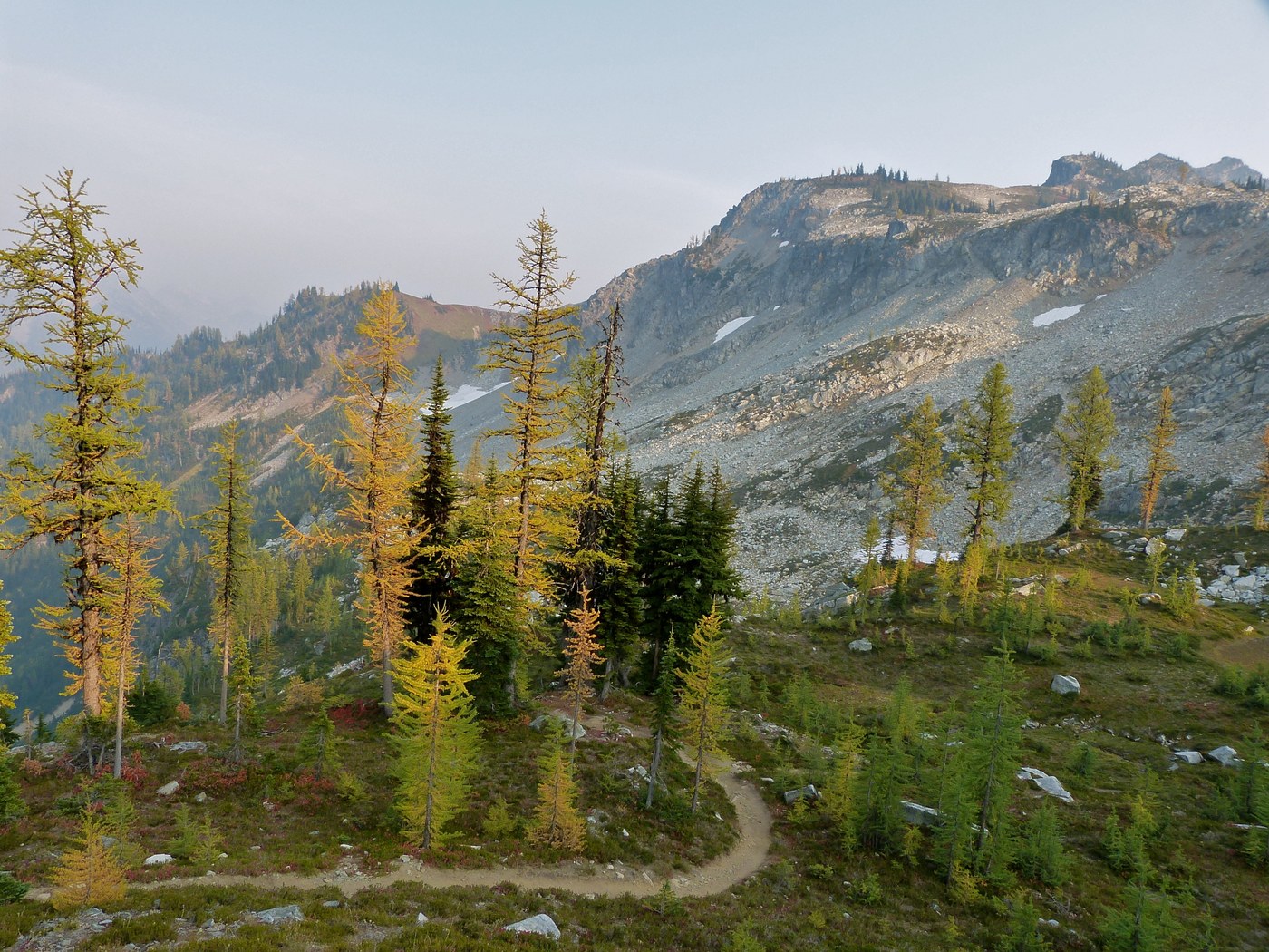 We choose to do this hike in the afternoon to give the clouds a chance to burn off. As we drove east on highway 20 the blue sky came through, and though cool in the cloudy west side, the temperature rose into the upper 70’s as we approched Rainy Pass. No extra layers of clothing were needed on this hike! We were hoping to catch the larches in their golden glory and we were not disappointed. A good half of the larches have turned. No berries were found to pick but the Huckleberry bushes were aglow in red at Heather Pass. We hiked counter clockwise to take advantage of the more gentle ascent on this beautiful loop trail.