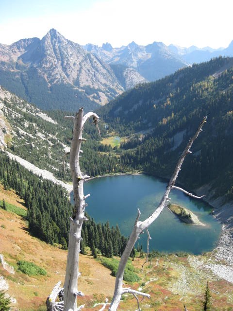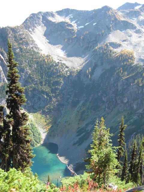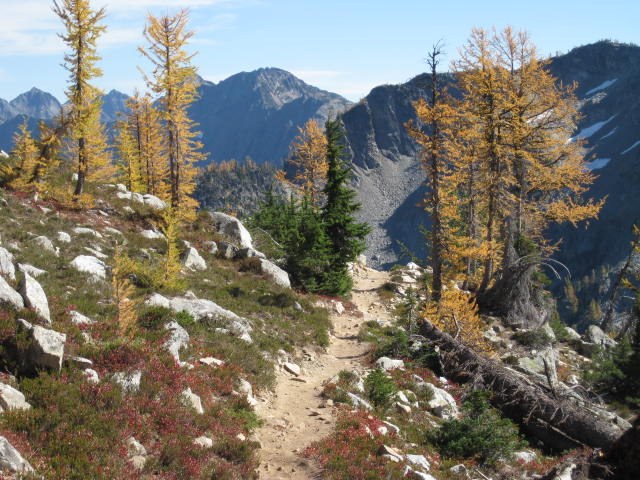 More hefty altitude gain brings you to the high point of the pass, approximately 6800 feet and even more temptation to stay for hours. The way down is steep but offers even more scenic vistas and lots of larches. The latter are not all quite fully golden yet, but close. The trail threads the narrow ridgeline precipitously at times all the while delivering a feast for the eyes. At one point it is possible to look down into Lake Ann and Rainy Lake at the same time! That's a narrow ridge!