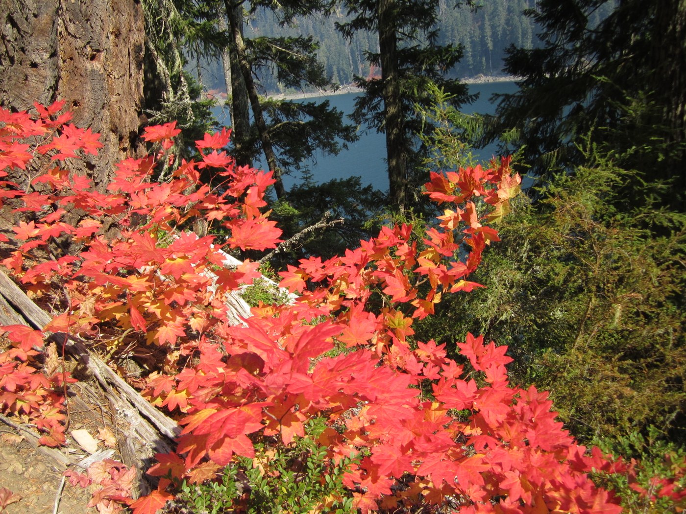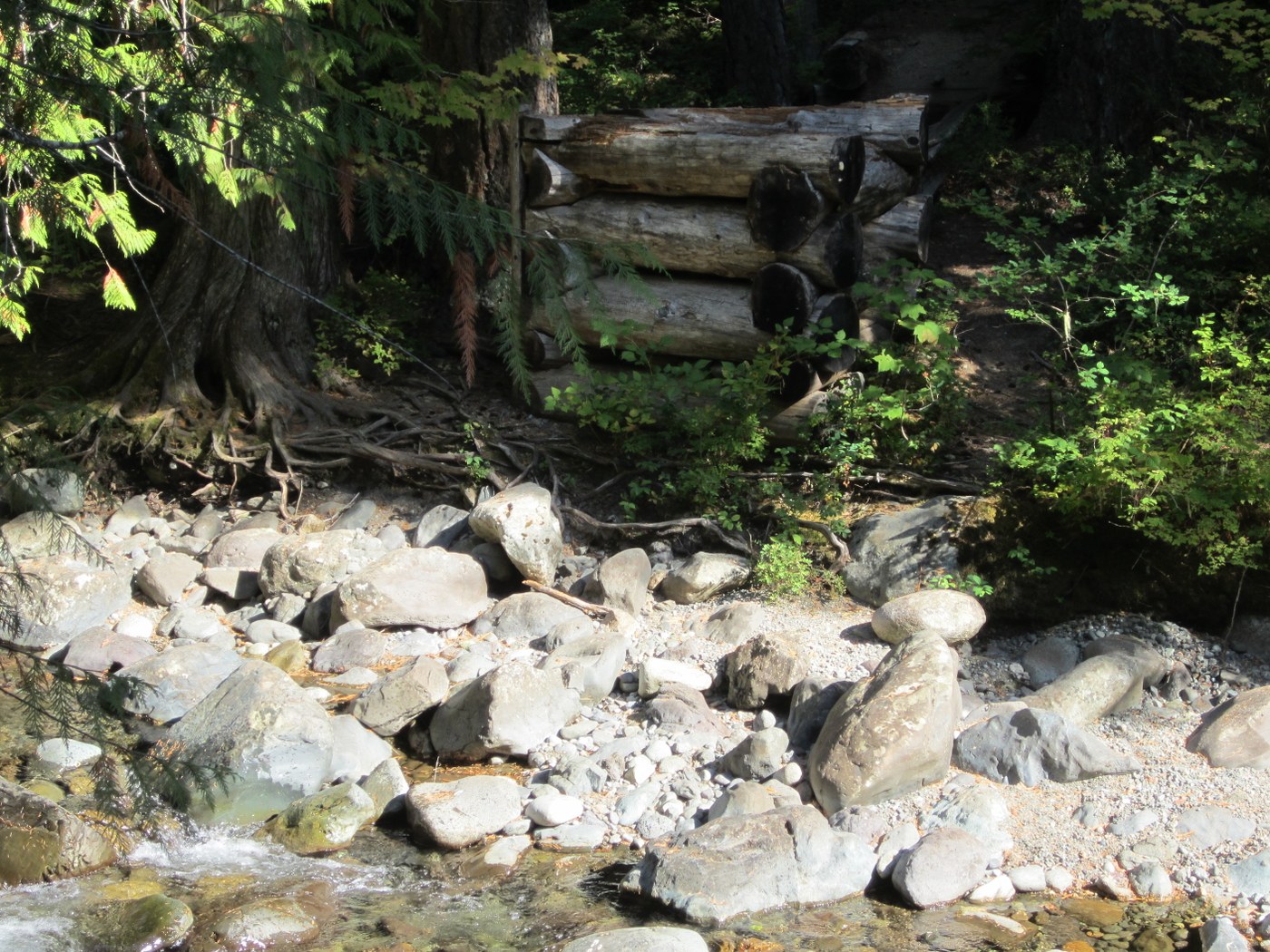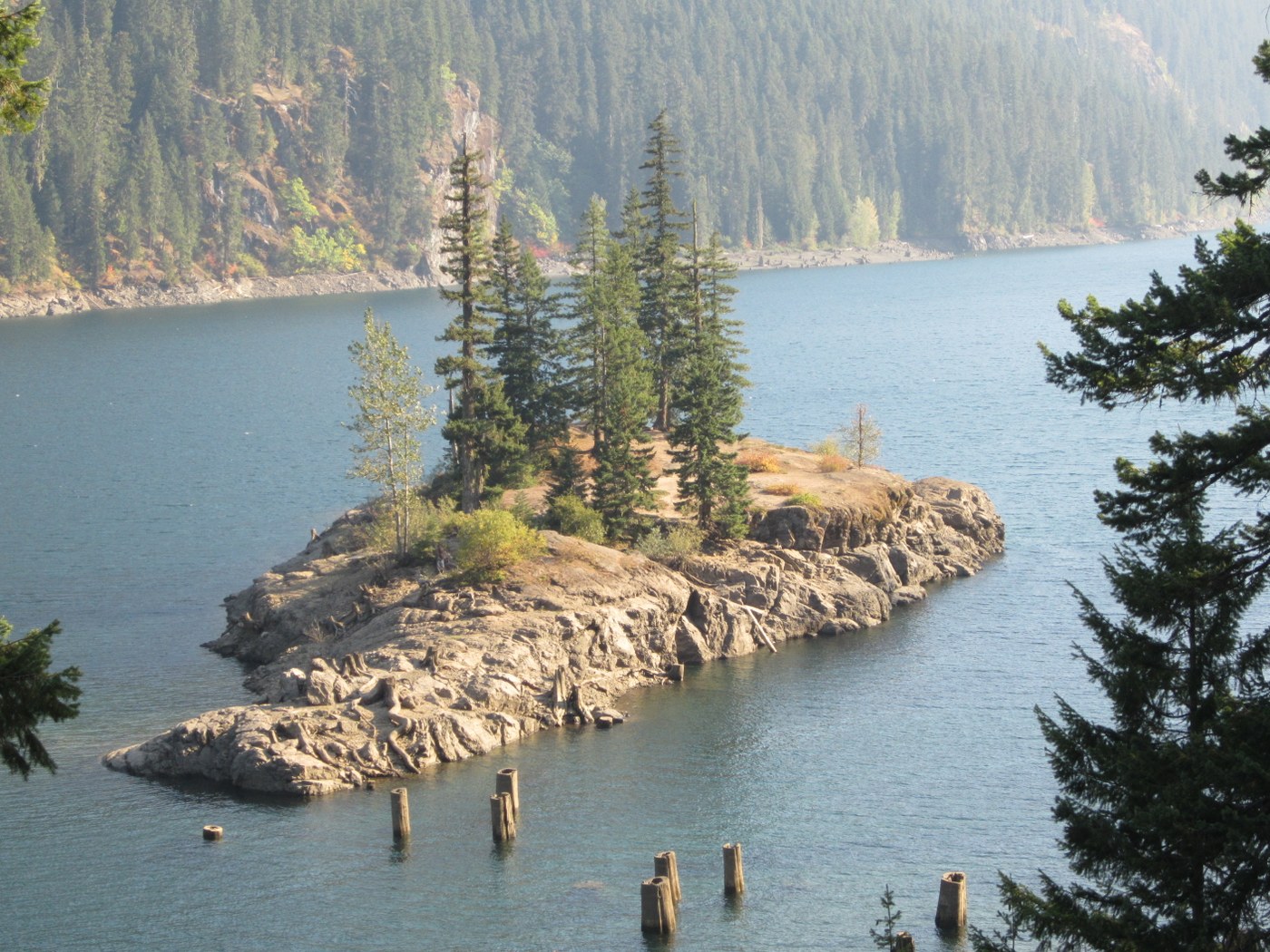 This is an upsy-downsy trail with lots of elevation gain and loss. Between the Box Canyon Creek crossing and a turnaround point at about 4 miles (close to Mineral Creek) we gained 1230 ft. going up and lost 970 ft. going down. On the return trip, we climbed 900 feet up and lost 1130 ft. going down. In spite of the inconvenience of repeated elevation gain and loss, the delightful high points are when the trail reaches one of the cliffs that offer a splendid view of the lake and an island in the lake. Near the island is a rocky peninsula that sticks out into the lake and has several camp sites. This appears to be a popular camping spot. They even have a fancy toilet with a real toilet seat. It appears this camping area is mostly frequented by boaters and not so much by hikers. The trail must have existed for a long time since there are remnants of puncheon board walks, most of it now rotten and decayed. At about 3 miles the trail crosses a creek coming off Box Ridge in a narrow gulch (difficult to cross at high water). There is an eerie narrow log high above the creek water but one would be better off crossing it roped instead of trying to tiptoe it across. One thinks that the lakeshore trail ends once it reaches the upper end of the lake, but it continues for quite a mile even after the lake is out-of-view. At the end of summer, the lake water level has dropped to a point where the upper end of the lake is just a stump farm. After a lot of ups and downs the trail joins an overgrown old mining (logging?) road and walking becomes a bit easier on flat ground, although the trail continues to gain elevation until it reaches Mineral Creek Trail #1331.