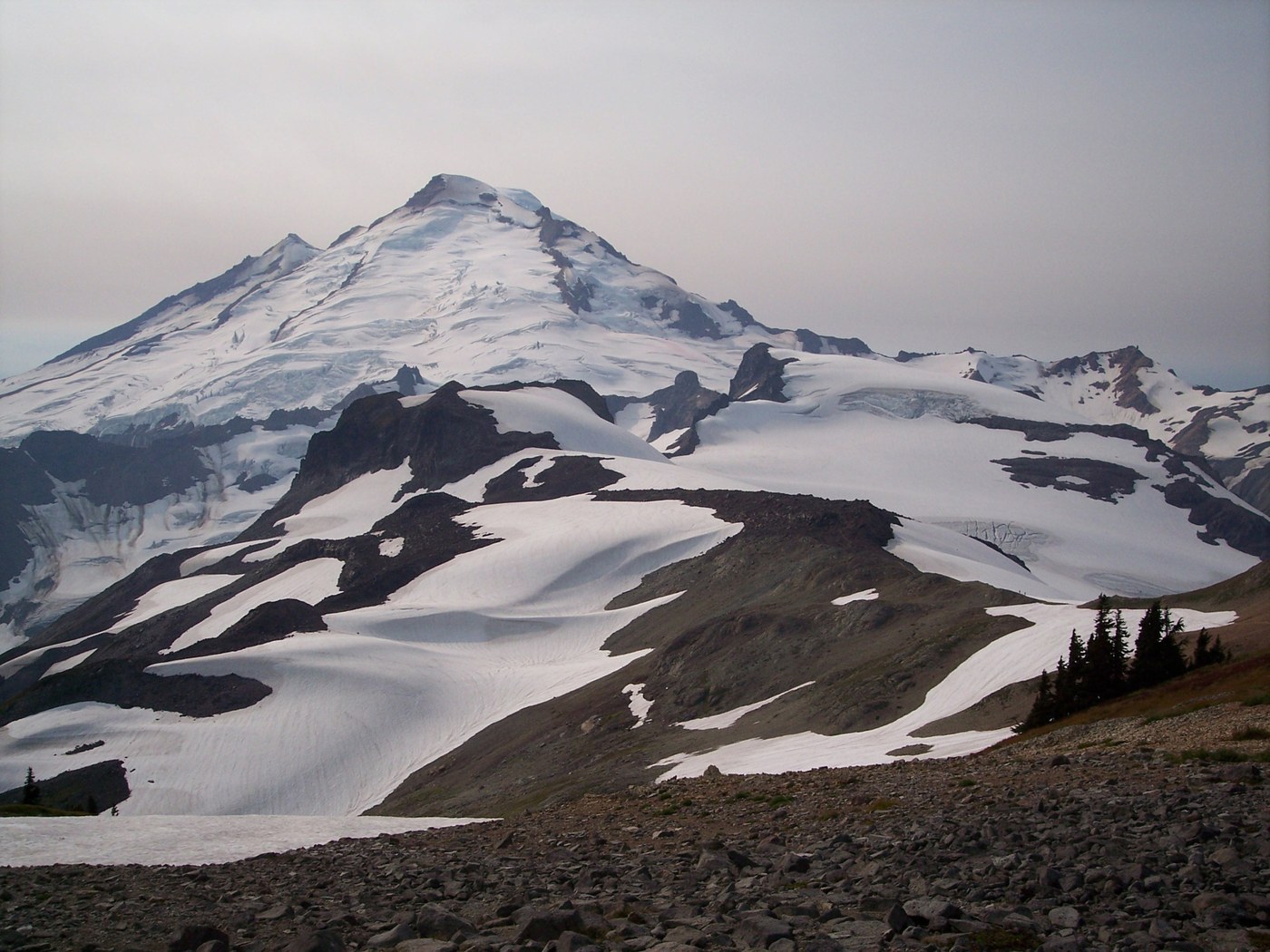 After lunch, we continued traversing, rounding Coleman Pinnacle and bypassing a side trail that explores the basin just south of the Pinnacle. We climbed up to a saddle due west of the Pinnacle, where we were able to see views both north and south. The trail continuing on to the Sholes Glacier was very inviting, but because we had toured the Chain Lakes in the morning, we were now at our turn-around time. The extreme close-up view of Mt. Baker was tempered slightly by wispy white clouds surrounding the peak. They didn't look threatening; they just blocked the sun.