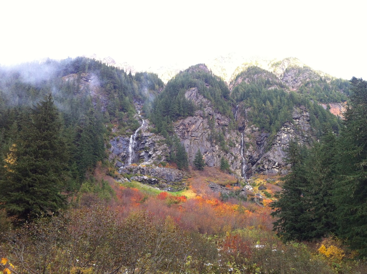 Today's hike started at 1330 in overcast conditions. The uppper Elliott trail was selected for the ascent and it was in good condition, though very wet with a few small trees down on the trail (not sure why no one else cleared them today, but I took care of them). The sun made a few brief appearances, and it popped out when I arrived at Goat Lake to reveal some very nice fall colors remaining in the hills. There were only small traces of snow and none on the trail. On the way back I took the lower Elliott trail. It was in very good condition, and I found it much more enjoyable than the upper trail, weaving through narrow, sinewy trail through old growth with the constant roar of the river alongside you. Great hike! Make sure your boots are waterproof!