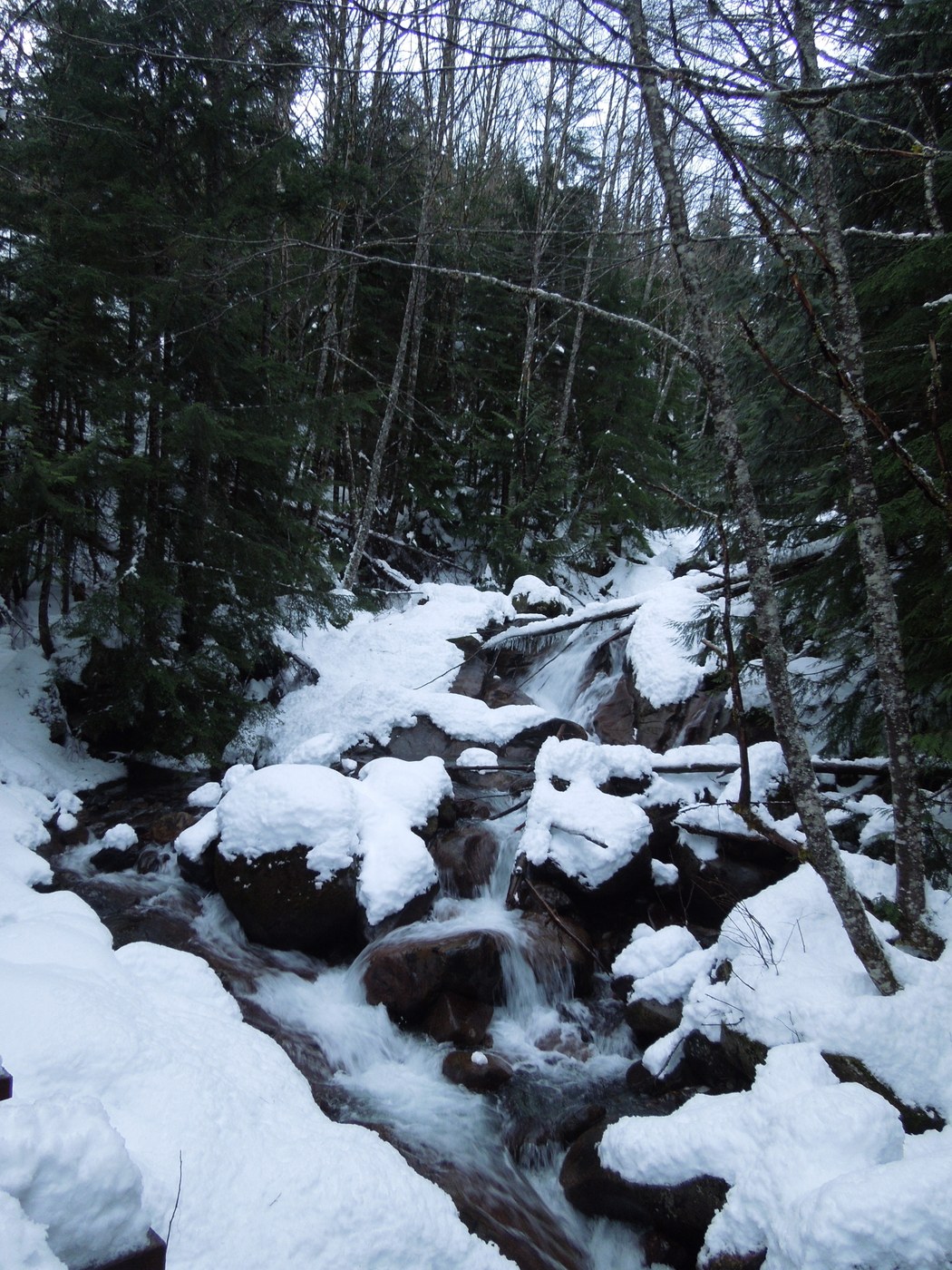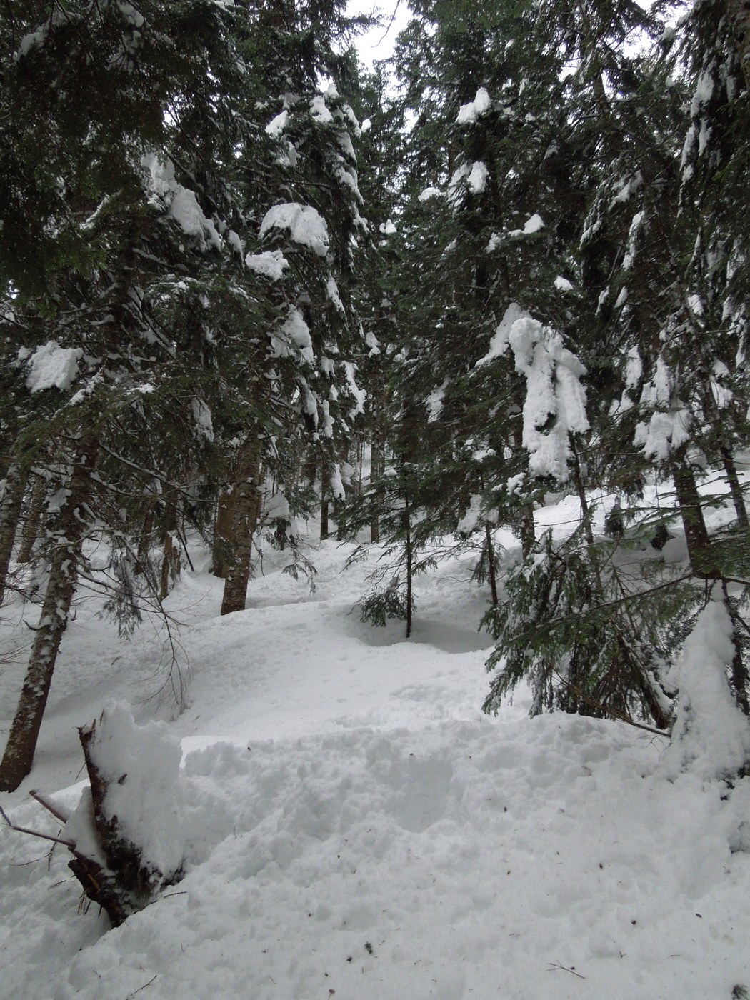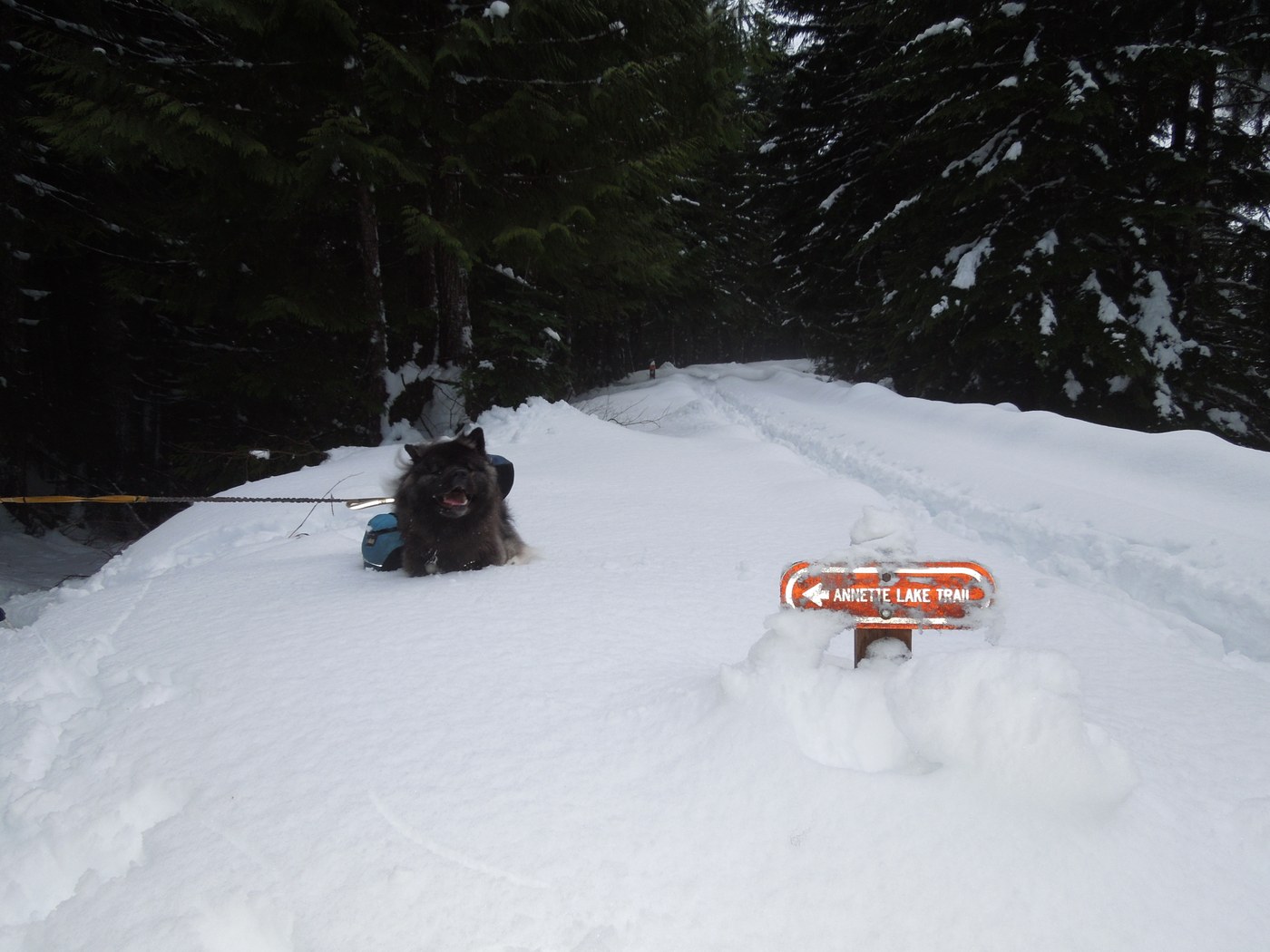 Snow began before the forest road so we started snowshoeing before the trailhead. Passed a few groups of fellow hikers/snowshoers on a well-defined snowshoe trail until we reached about 3200' where the trail was lost. We turned around as the others had before us and set up camp for the night--the snow was very deep and it would be too much work for our dog to try to continue. According to our GPS, we were about half-way to Annette Lake.