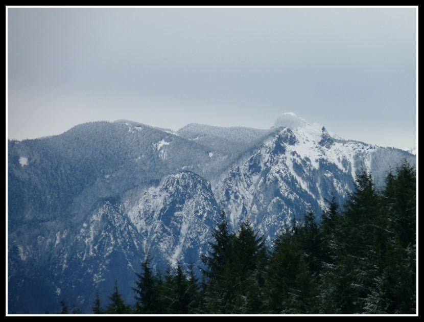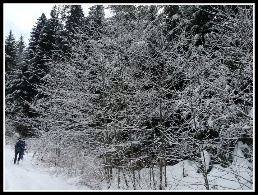 We descended from Middle Tiger to the logging spur below. We knew that once out of the forest the snow would be deeper. Just how soft it would be would determine whether we could reach East Tiger or detour directly to West Tiger 1. At the bottom of the trail is a wooden gate to keep out bikes and horses. It is the narrowest one I have ever seen. I had to know if beanpole Gary could fit through. Much to my surprise he did though even he had to turn a little to fit. As expected the snow was now several feet deep. There were some post holes from a hiker who had passed through when the snow was much softer. For the most part it held our weight. John and I had more problems with sinking knee deep or more. It was tiring but not as bad as I feared. After the unexpected bushwhacking I did not need more extra tiring travel. If the main road was even softer that would probably rule out East Tiger for me.