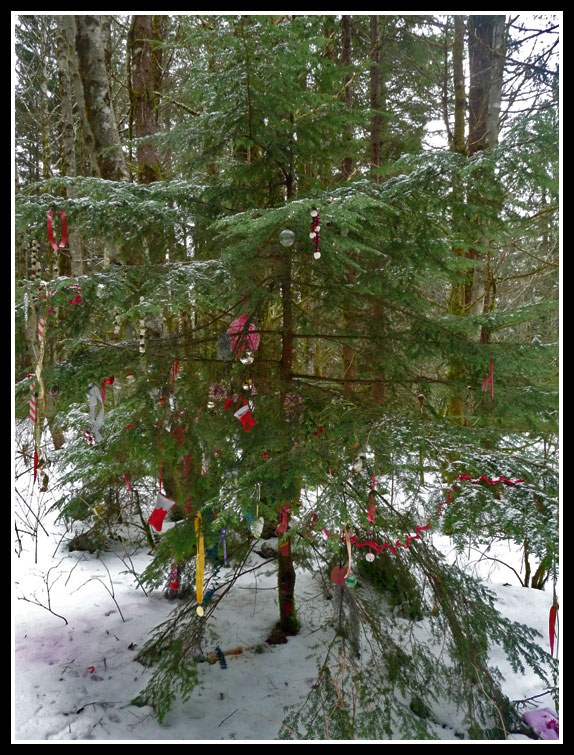 We had some of our lunch on Middle Tiger and more of it on East Tiger. It was 12:54 and we were 7 miles into our trip. We still had half the distance to cover and only 3.5 hours. It had take a little over 4.5 hours so far. On the positive side, we had gained 2700'. There was much less to gain the rest of the way. Now came the most important bit of navigating. The East Tiger Trail over to the Christmas Tree near Tiger 1 is a sketchy trail in the summer. It would be completely under snow this day. We used our GPS units extensively to find our way. It worked well as we reached the Preston Railroad Grade right at the junction with the East Tiger Trail. The snow was less deep now and we could see cut logs and figure the trail location much better. There are also a number of paint spots on trees to help with navigation. We continued to drop to the 2180' low point. A little climbing brought us to the junction with the Paw Print Trail. A few minutes later we were at the Christmas Tree. Just 12 days earlier we did a headlamp hike there in non stop rain. Much nicer this day. We picked up a filled balloon a few minutes earlier and added it to the Christmas Tree.