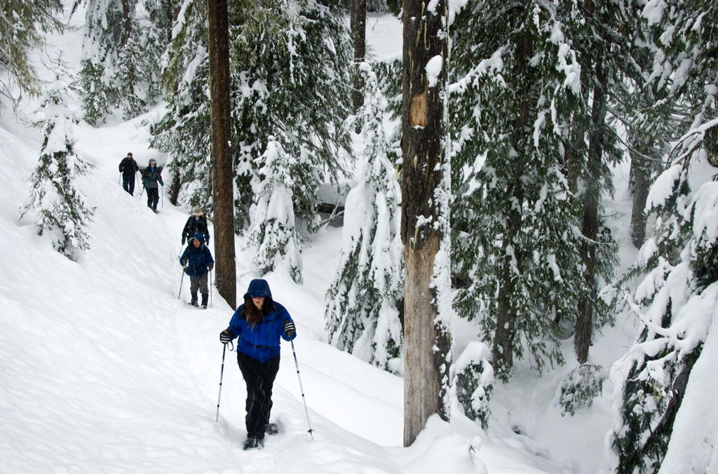 I led my second Saturday Snowshoe of the season for the Cascadians on this snowy day to the Cooper River Trail. We snowshoed the 1/2 mile or so along the groomed road through the Salmon la Sac campground to the trailhead and then about 2 miles up the trail. The trail was compact & obvious the entire way with perhaps an inch of new snow on it. It snowed most of the day from low clouds, but the forest was beautiful. We heard a few snowmobiles going up the Cooper River Road across the valley, but only saw two other snowshoers on the trail. I was a little disappointed that the only nice views of the Cooper River were in the first 200 yards or so of the trailhead, but it was a great snowshoe, nonetheless.