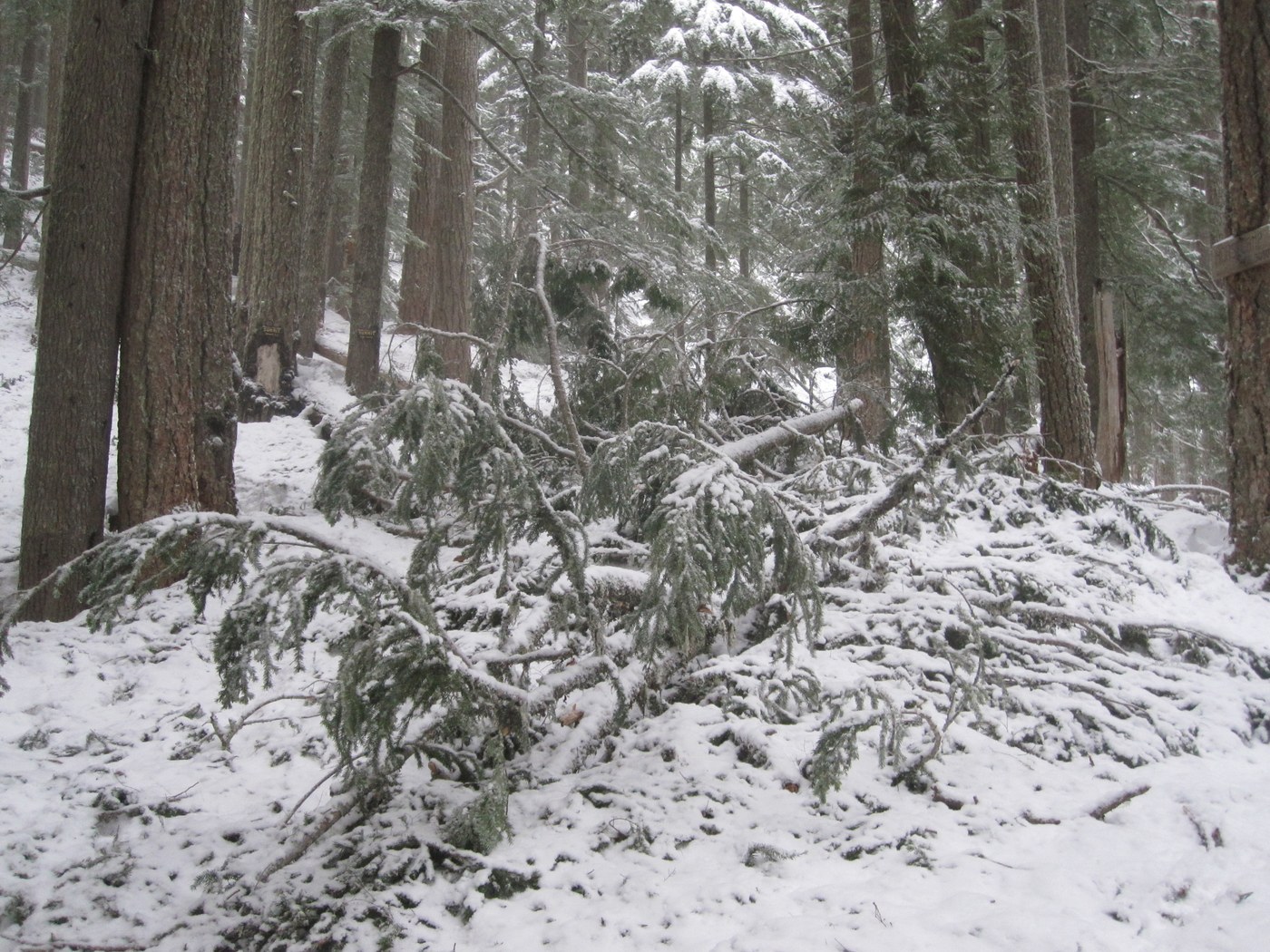 We started up the trail arount 10:30 am. Hit frozen snow on the trail below Horse Camp, and put on our microspikes. Above Horse Camp, fresh snow made snowshoes necessary. By the time we got to the summit we were sinking in about 8" or so on snowshoes. We reached the summit just before 2:00 pm. We didn't stay long because it was snowing and windy. Took the loop down which was a nice adventure with a difficult stream crossing due to fresh blowdown blocking the small log bridge over the stream. Got back to the car about 4:30. The trail crew is going to have a busy time as there is considerable new blowdown at various spots on the trail.