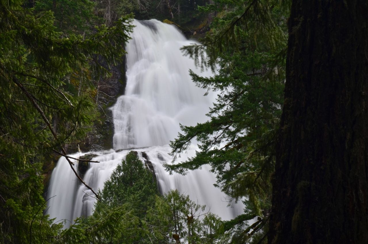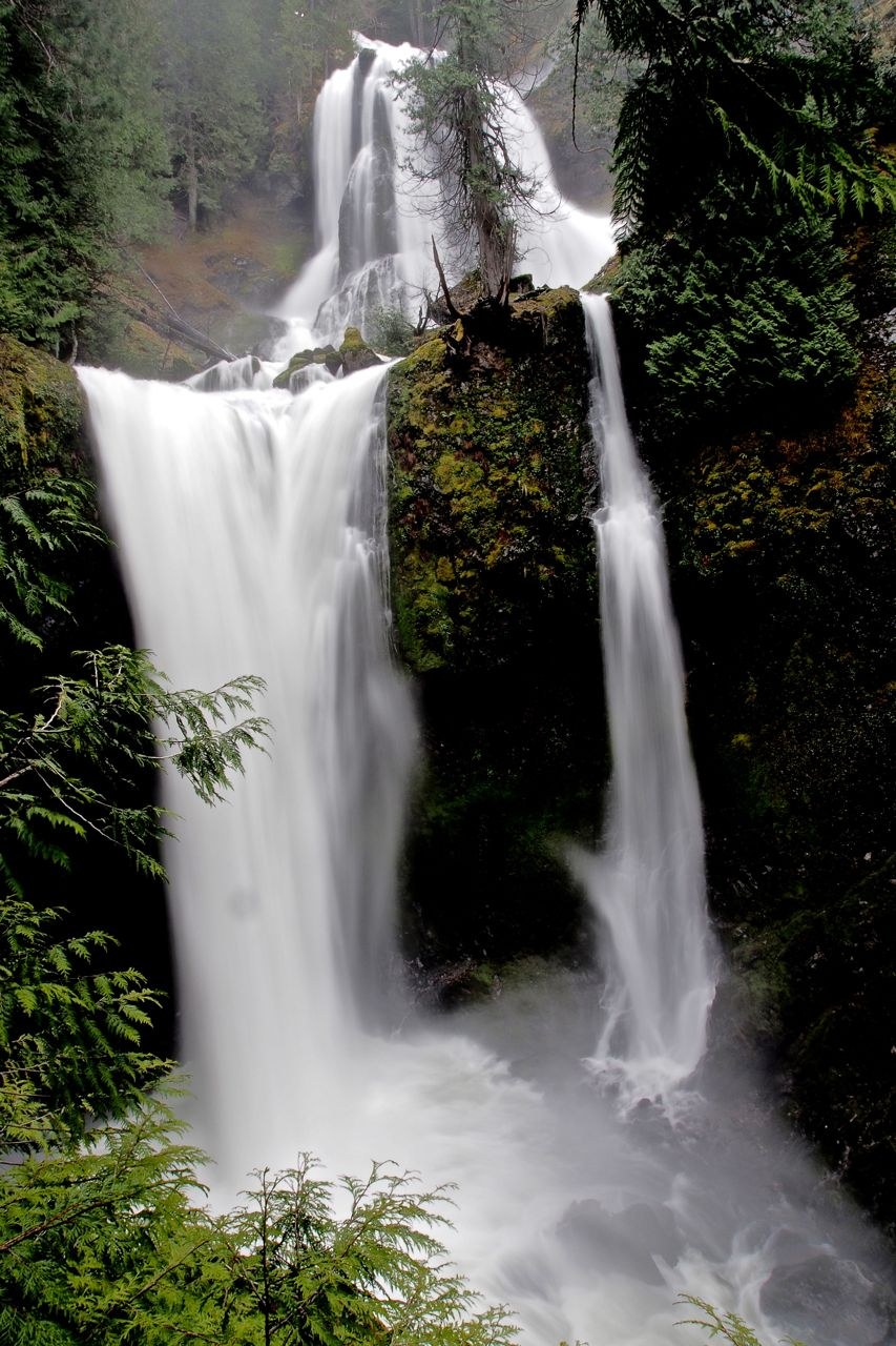 There is a new and very large graveled parking area for Trail 152 and 152A. FS 3062 now ends at the Lower Falls TH parking lot. The road to the former Upper Trail has been blocked off. The trail to the lower falls viewpoint is clear and in excellent condition. Falls Creek was flowing strong and the falls were SPECTACULAR as always! This is an easy 4 mile RT hike and a highly recommended hike for all ages!!!! This can be a very popular hike, but today we saw only one couple and a grandma with her 2 adult granddaughters. From Carson, drive 15 miles north on Wind River Road (County Road 30) to its junction with Forest Road 3062. Turn right (east), and drive 1.8 miles to the TH. There is a restroom and picnic table at the TH.