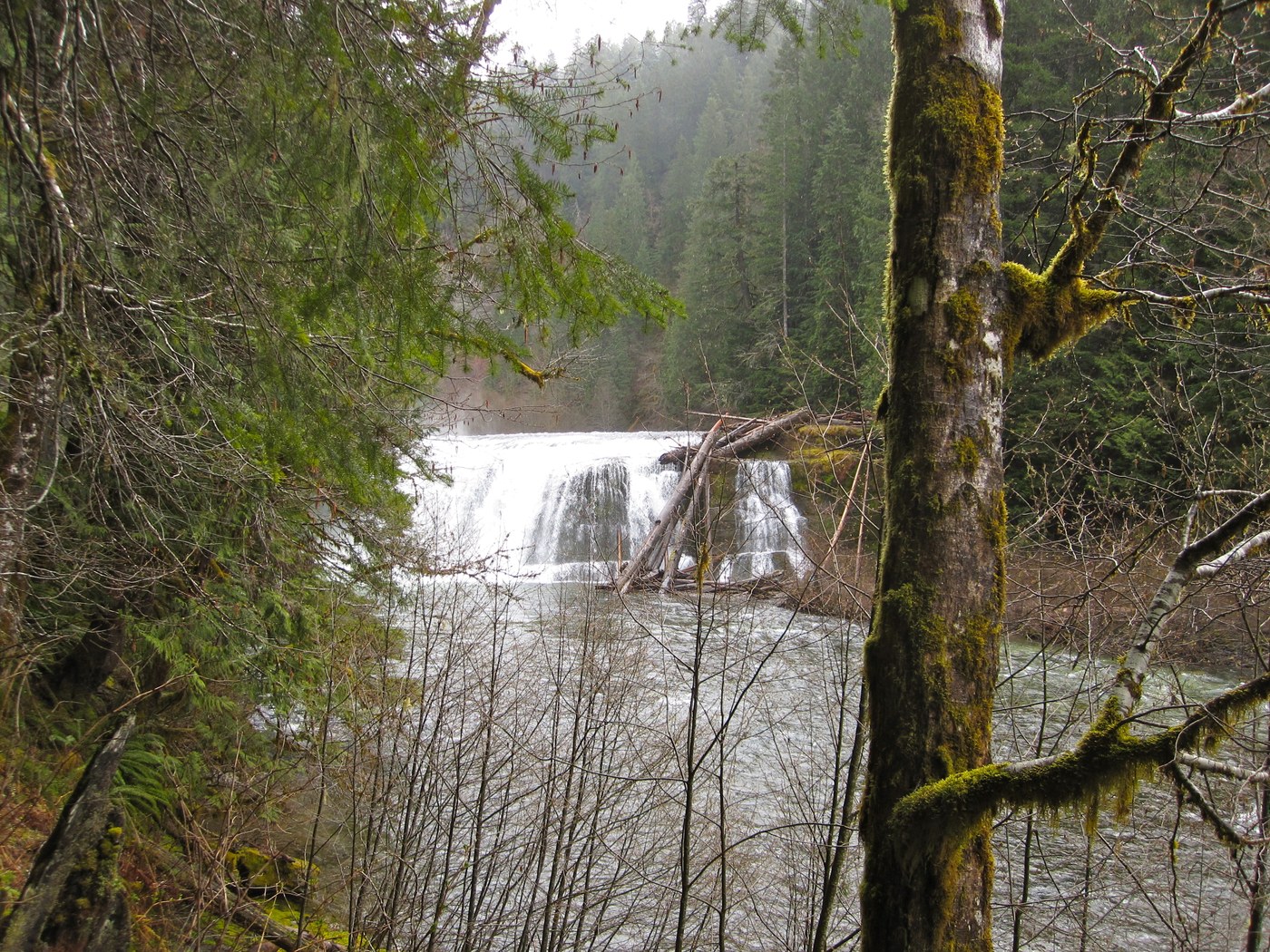 We started the hike just after the first Lewis River Bridge. The weather was pretty cold and it snowed on us for most of the hike. We hiked from the Lewis River Bridge to the Quartz Creek Trailhead, about 4 1/2 miles one way. There was a significant amount of snow on the trail between upper falls and the Quartz Creek Bridge/Trailhead (about 1/4 of a mile) up to 10 inches deep in spots. The trail between the upper, middle and lower falls was pretty clear and not too muddy. There were perhaps 5 downed trees across the trail, all fairly easy to get around. There was a large volume of water going over the falls right now, it's pretty impressive. We didn't see any other people on the trail all day.