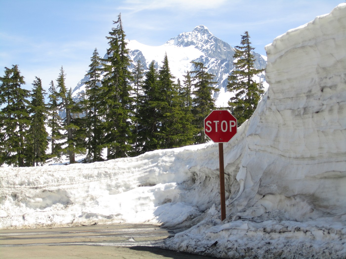 Because I started backsliding in the mushy snow on the steep slopes after the pass, I chose to follow the easier grade of the winding highway which becomes more obvious on top of the ridge the closer you get to Artist Point. The trail is uphill the entire way to Artist Point and one cannot see Mount Baker until you have topped out at the point itself. The entire area is really a complex of ridges and knobs that might be confusing to some and there are a few different possible routes.