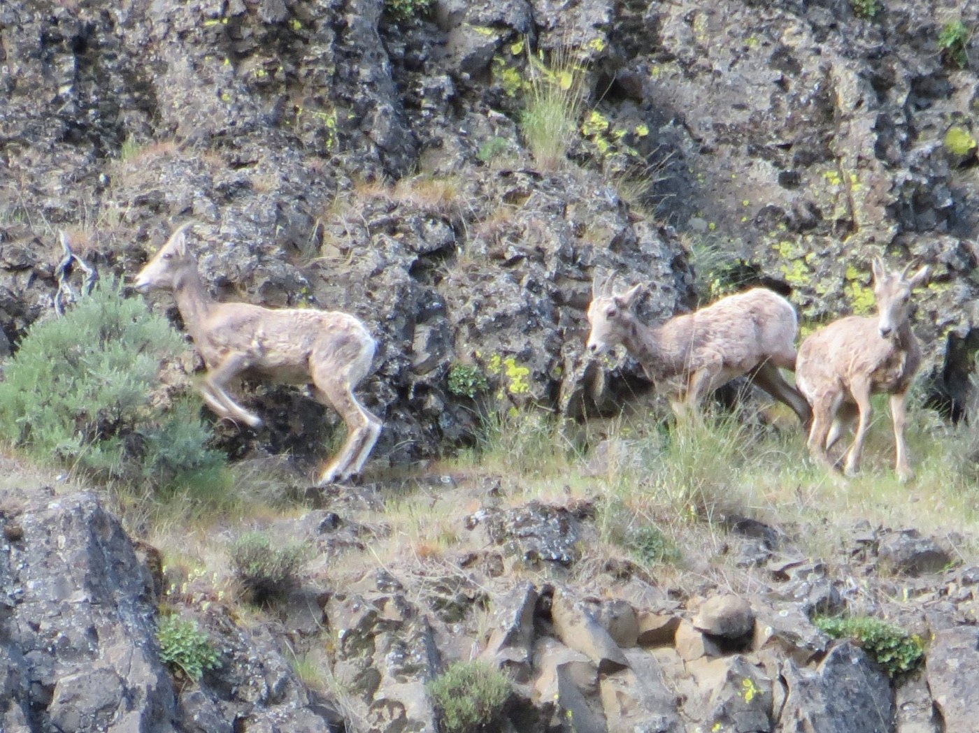 Herd of bighorn sheep seen up on the rocks in the canyon. 1 big ram and several females.