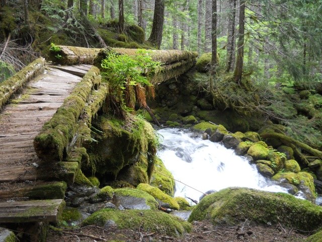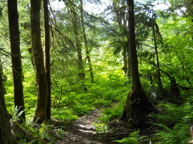 Today we hiked Necklace Valley. This is a beautiful green route through old second growth timber. It’s an easy hike with some ups and downs, but no serious altitude gain until after the second river crossing at about 5 miles. After that the trail is steep and rocky. There are 3 pretty large camp sites and one small one in the area we covered with the first I’d guess near the first mile. And all are on the river and pretty. There were few people on the trail (on a Friday), too early for many bugs, but the spring flora and Fauna is outstanding. This is a green garden that inspires fantasy. There were a few blowdowns, and deadfalls, but nothing too hard to climb over or under.