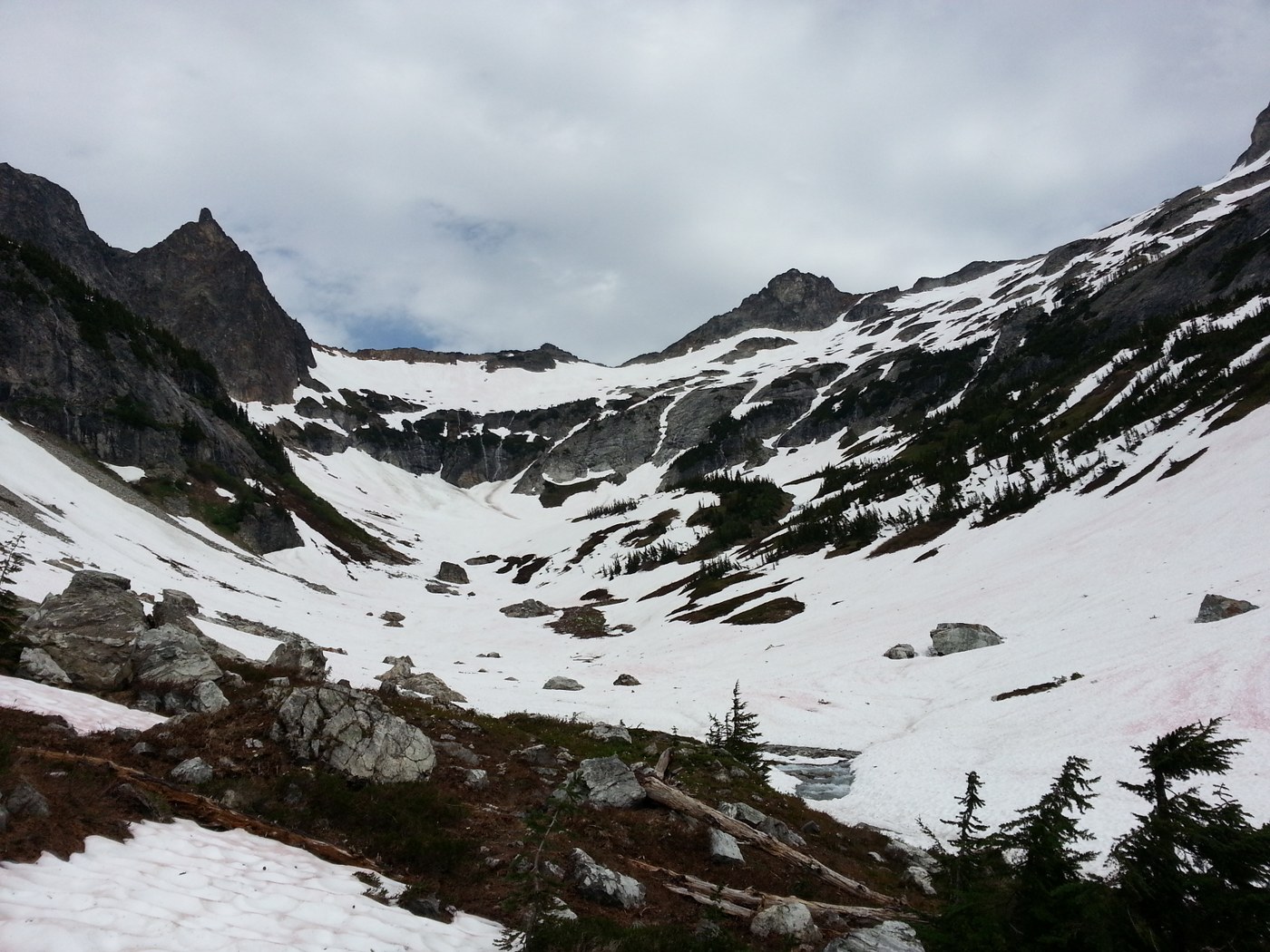 Spider Meadows is a fantastic multi-day hike up the Chiwawa River drainage. Spent two nights and hiked up DumbBell peak for a day excursion. Lots of water on train, flowing creeks, so need to dry out your boots or go bare foot on the many stream crossings. Meadow is pretty clear of snow once you arrive. There were a few campsites that were not in snow, most still had some snow. Above the meadow snow is pretty thick, but fun if you have some good boots, crampons, or ice ax. With the hot weather I would guess the snow would melt quite a bit in the next couple weeks. Bugs were not an issue, but starting to hatch. Very little blow down along trail and other than the water, the trail is in excellent condition. Many folks going up to Spider Glacier, but we enjoyed heading directly up the drainage and looking back down the Big Creek drainage. Highly recommend this hike, it was very quite and only 4-5 cars at trail head. But probably getting busier throughout the summer.