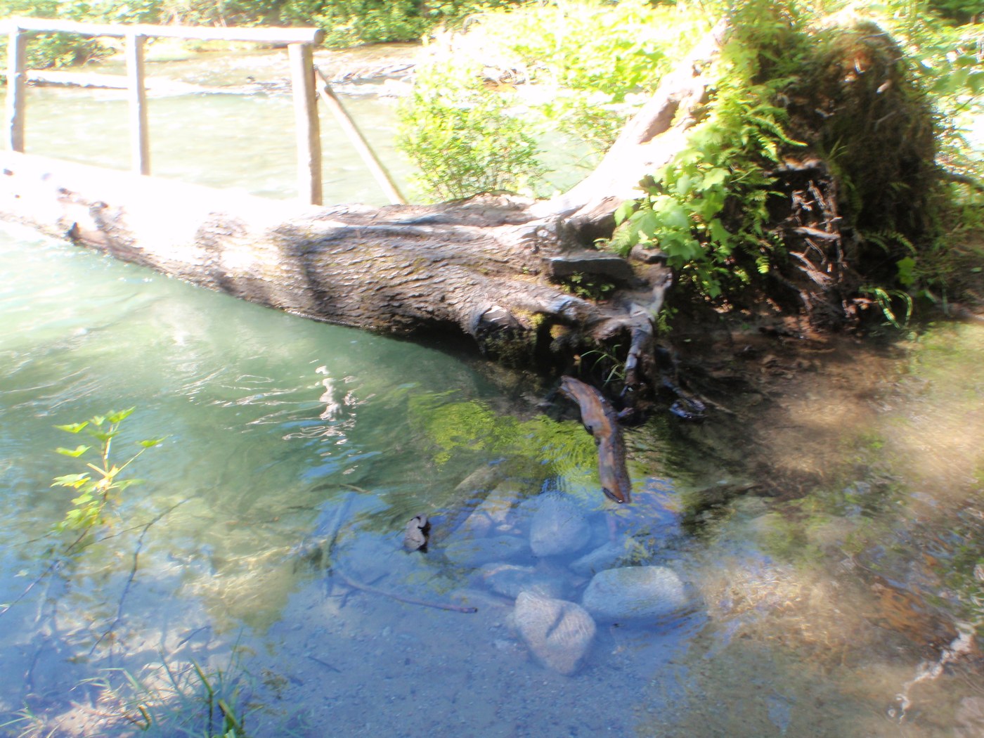 About 10 water crossings in the first 5 miles. All shallow enough to keep feet dry. The big log crossing the river at mile 1 was in good condition. River flowing very fast here. Looked to be a campsite just after this crossing - which was intentionally blocked by cut limbs but still usable.