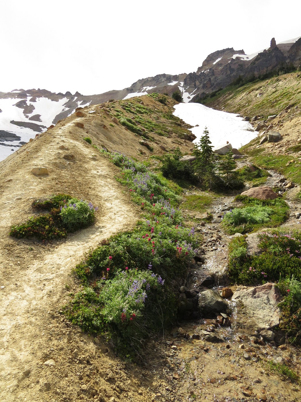 One of my favs, trail has snow about .5 from camp, very easily traveled. Tons of day hikers and climbers alike share this amazing trail. We arrived at camp early and got the only snowfree spot #2, group site is half melted out, but all other sites were under snow will be another week or two i would guess. Saw 2 marmots, had a great dinner and drinks in the meadow. Chatted with couple (m&m) new to our lovely state and told them about some of my other fav trails in the park. Also shared info about this site and the resources on hikes. Woke up around 4:30 to get some pink in my pictures always worth it for the sunrise. Good times with great friend.