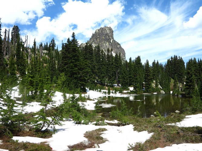 The trail to Cathedral Rock is in a great shape. You start to see snow patches after you get past Squaw lake. The meadow area under the rock is about 70 % snow covered still. I went up and over Cathedral pass to see the awesome view of Deep lake and the surrounding mountain. There were many hikers in the area.