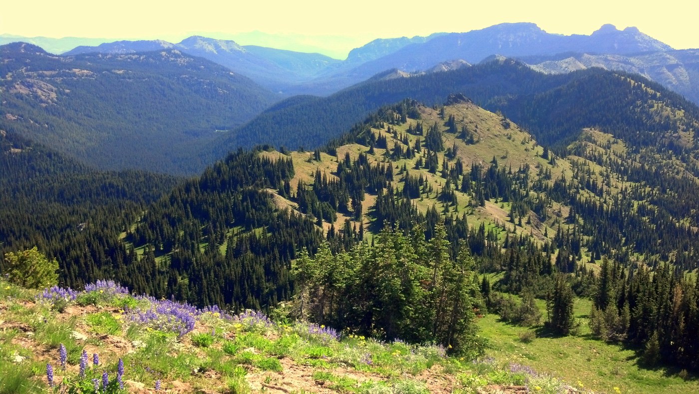 The first 8 miles or so of this trail is a fabulous ridge ramble - flowers continue to emerge in bright splendor and views are wide and dramatic. There is no longer a snowfield to cross beyond Sourdough Gap. Watch the signs for successive trail junctions at Bear Gap, Fog City Trail and then just below Crown Point. We turned off the PCT where the Union Creek trail turns north - look for the sign for Union Creek trail just beyond the sharp left hand turn on the PCT below Crown Point, and angle right to descend along the steep slope. This trail has been severely damaged by lots of horse traffic under wet conditions, and in places is sloughed off down the steep hill with barely a tread left. After about a mile of those terrible conditions the trail levels into pretty Cement Basin, with small meadows and groves of trees. A group of elk were spotted in the distance and we passed a group of cows and juveniles in the trees (making funny little mewling noises!). There is a steep climb up from the basin to a high saddle, then a steep descent into the Lakes Basin. After the saddle just look for unsigned side trails going down into the basin, and another turn to continue downhill to the lake. Camps around the trees are horse-damaged but enough flat spaces were found near the fire ring on the nearside of the lake to make a good camp for our group of 7 (5 tents). There was also a camp on the far side of the lake, but it was forested and buggy. Flowers were lovely in the basin and there was a group of about 10 goats climbing around on the crags above us. Total of about 11 miles on this day. In the future, I would recommend staying on the PCT beyond Scout Pass and descending from there to Basin Lake - the Cement Basin trail has lots of climbing and descending and much of the trail is in poor condition.