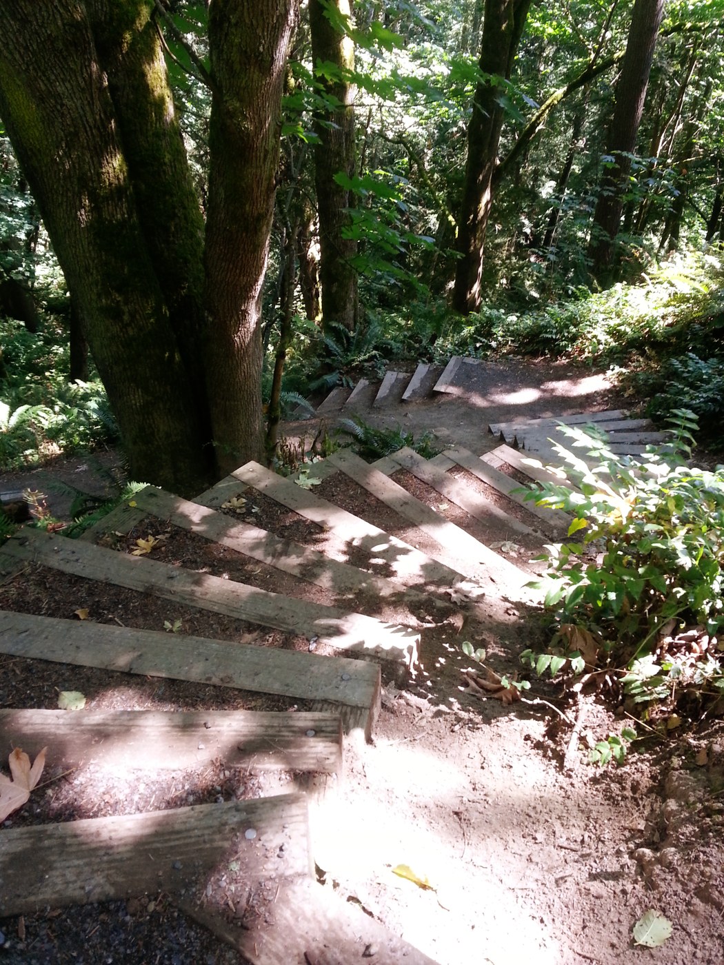 After entering the forest from the trailhead, we took a lovely and beautifully built set of stairs that went down, down, down to the bottom of the gulch. Soon after that, we crossed a picturesque bridge across a small stream. There's a pretty amazing tree there, roots spanning the stream where it has washed out the soil beneath. When given a choice, we opted to go left, and up a hill to the trail access point behind the Staybridge Suites (the 3rd access is at the Mukilteo Library). We returned to the park via SR525, and the walk was about 1 1/4 miles.