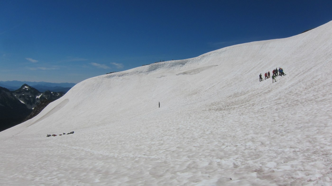 Snow after Panorama point, especially a steep bit. Bring poles unless you want to ski down on your backside. I watched a parent hiking with a small child slide down with the child in his arms. It worked.