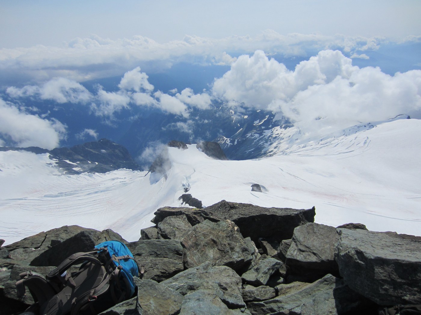 I loved every part of this trip. The hike to the high camp at the toe of the Sulphide glacier would be worth doing in its own right. Views of Baker and other north cascades peaks are outstanding, and blueberries are ripe! We set out from high camp early on a foggy morning, hoping for some clearing. By the time we reached the ridge we got some sunbreaks and awesome views of Baker. The route follows a smooth part of the glacier with few evident crevassses, but we passed by some huge ones. I wasn't sure what to expect of the summit pyramid scramble, having seen many conflicting reports. We somehow missed the yellow arrow painted on the rocks, and headed off to the right of the usual gully. The climbing was lovely if a bit exposed for a while until we hit some very exposed class 5 stuff on a ridge. Scrambling around to the left we could see the gully we should have taken, but it looked like we might have to down climb a couple hundred feet to get into it. Fortunately we were able to discover a route into the gully that was a lot easier than it looked. Climbing up the gully was super fun although I was glad we were the only party climbing that day. I would not recommend doing this hike on a weekend. We climbed in and out of fog but were blessed by a sunbreak on the summit. We all exalted and ate and then had to go down. A couple of members of our party were new to scrambling and were toproped for sections of the downclimb. I was really glad I had done Del Campo a couple of weeks ago since I felt well prepared--this climb is not that much harder. I've seen all sorts of rankings for it I'd say if you stick to the standard gully route it is mostly similar to Del Campo which everyone agrees is class 3, with a few somewhat harder sections. Routefinding is needed to avoid more technical moves. The main danger is rockfall--helmets are highly recommended.