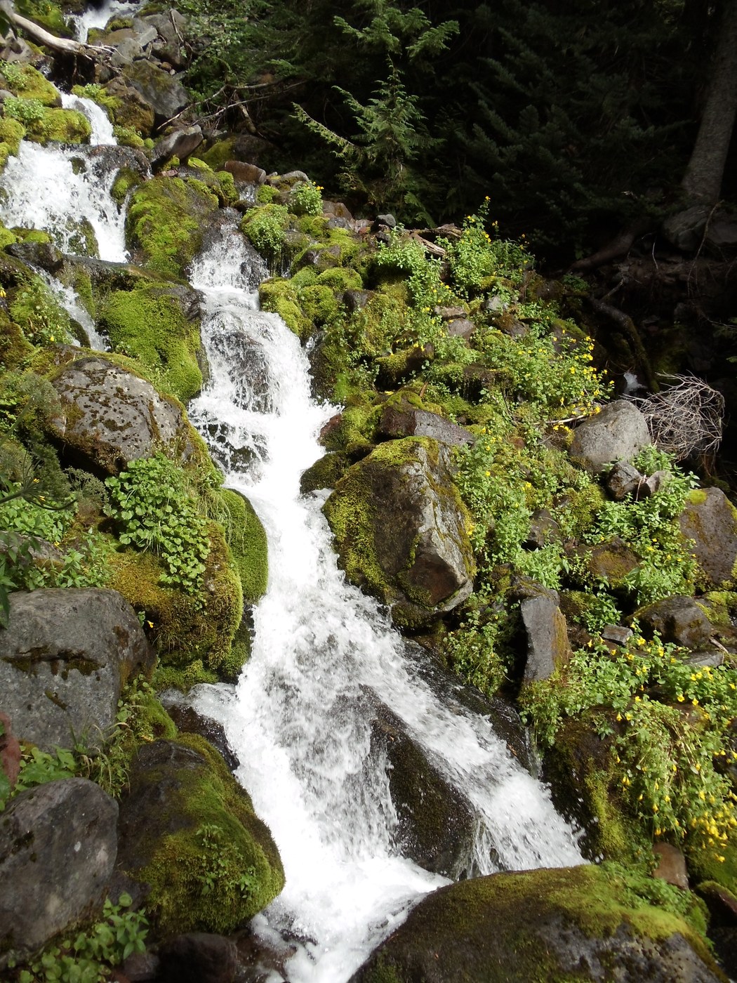 There is no sign when arriving at Spray Park. It's just a meadow, I think. I did venture farther than the meadows, having read previous trip reports, but I wasn't sure how far to go. It was cloudy and drizzled at times during my hike, so I didn't get to see the top of the mountain. there were only intermittent, small patches of mud. There are some pretty falls. I didn't see any critters, either.
