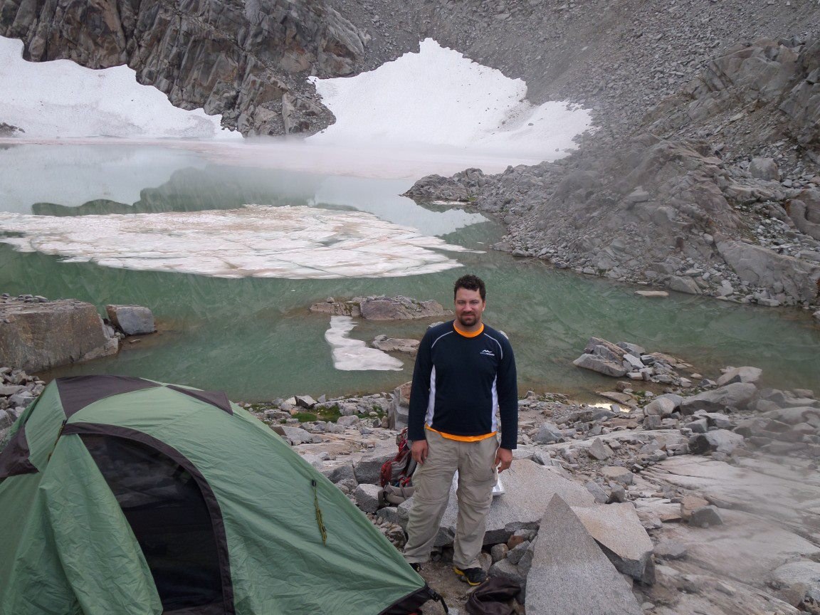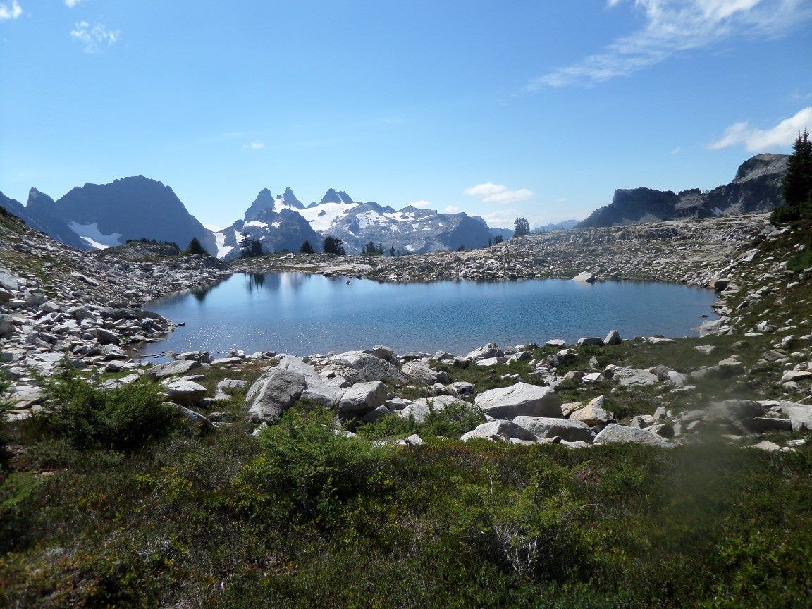 After a warm night at Big Heart, we continued on the now unofficial trail toward Chetwoot Lake. The trail wraps around to the backside of the ridge between Big Heart and Angeline Lakes, and you can peer over a spectacular knife edge down to Angeline before heading up. At this point, cairns (occasionally) mark a route that involves less trail and more scrambling, but remains along the same spine between the lakes. After ascending some more, you finally attain the ridge between the Chetwoot and Angeline lake basins. Descending to Little Chetwoot is a bit steep, but doable. We might have missed the route to the larger lake - it's easy to do.