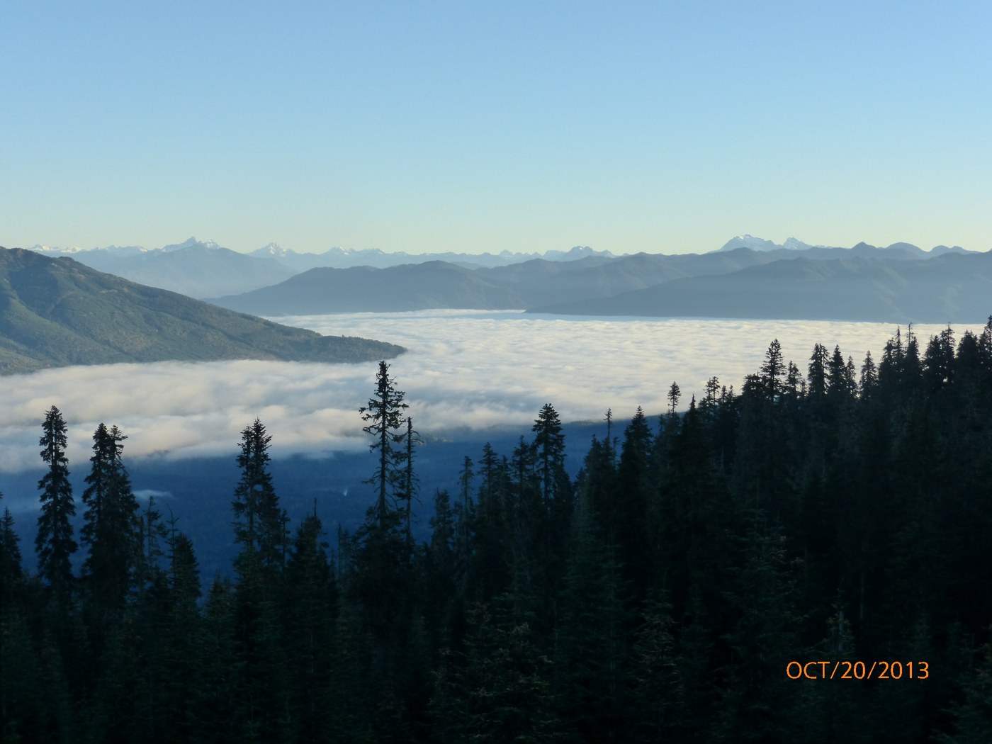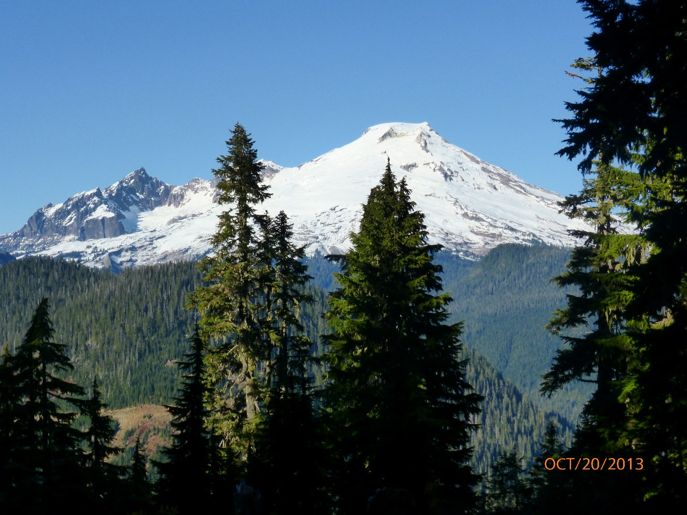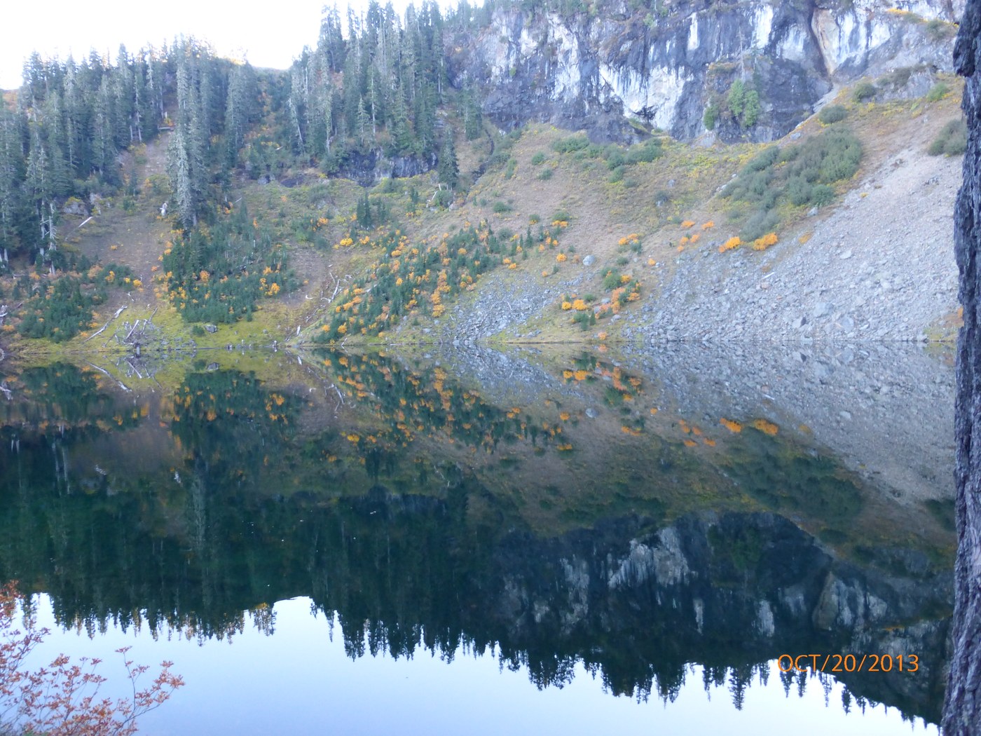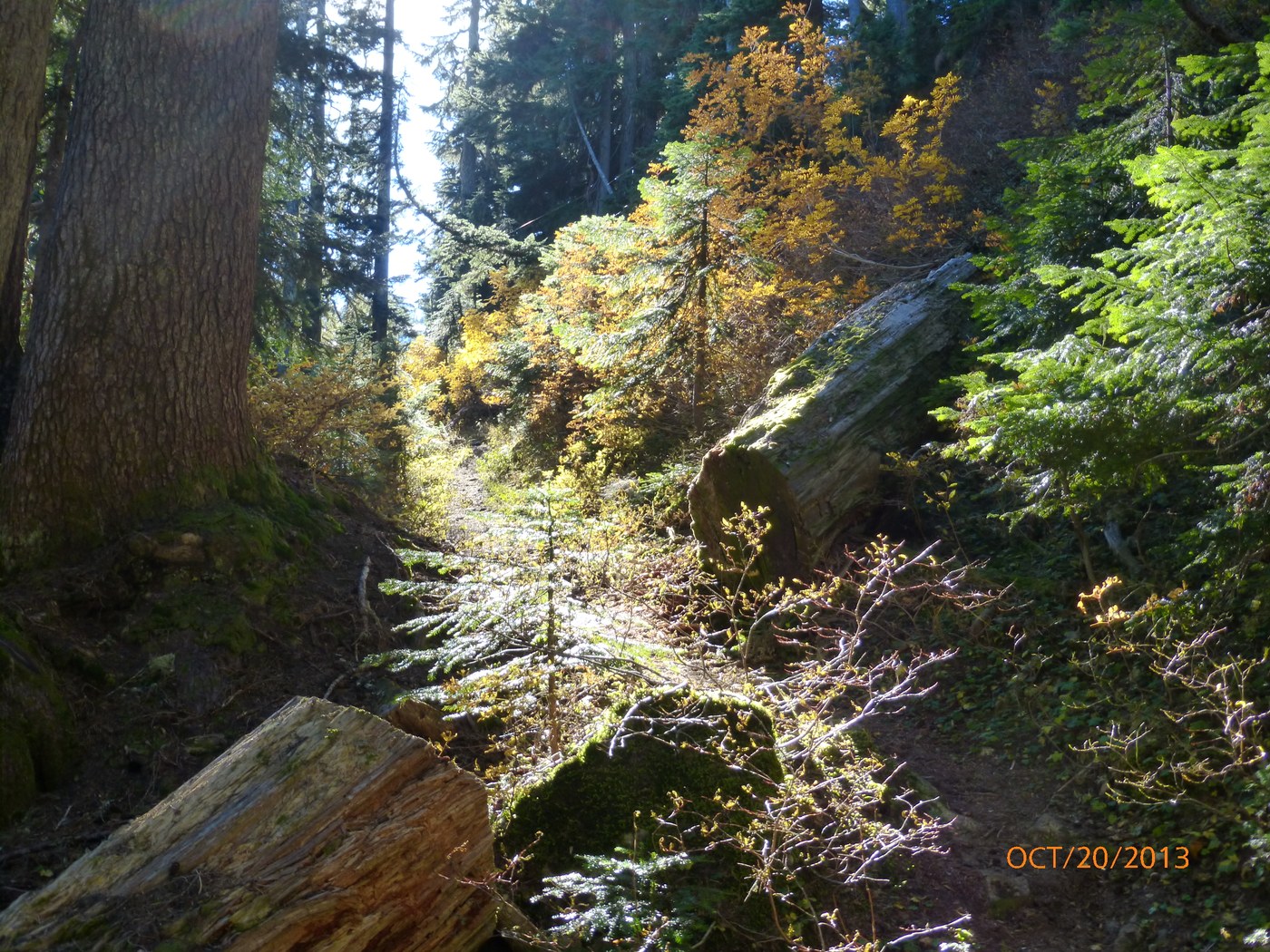 While a lot of the Puget Sound area was covered by a mostly high fog, about 6 miles into the Baker Lake Rd, it cleared off and there wasn't a cloud in the sky (very unusual)! I was taking my 5-yr old grandson on a hiking/picnic. It was a spontaneous decision, so we got a late start and didn't arrive at the TH until almost 2 PM; there was only one other car there and we met only two cars coming down and only one hiker/dog on the trail (probably lite use because of our late start). The first 1-1.5 miles on FS 12 road had significant potholes that were a little hard to see in tree shadows, but beyond turnoff to Schreiber Meadows, road was in pretty good condition for the next seven miles. We took the Dock Butte branch first, and as expected, it was relatively steep with a lot of rocks and tree roots. We encountered snow at about 1.4 miles in, so we stopped there because grandson didn't have good traction boots. Had some nice peekaboo views of Mt.Baker/Shuksan and some Fall color. A few damp spots on trail, but no running water. Went back down and took the Blue Lake trail; trail was in pretty good shape, but encountered many rocks/tree roots last 1/4 mile. Hiking book says there is 70' elevation loss to lake, but it was a relatively gentle up-and-down until the last 60-70 yards to the lake, which was very steep and mostly a tangle of tree roots. Several damp/muddy spots and a few trickles of water across trail, but I could see that because of the drainage slopes some areas would have some significant water crossing it during the late Spring early summer snow melts. All in all, both trails were very scenic and a good short hike for families, although sections of it would be a challenge for 4-6 yr. old children.