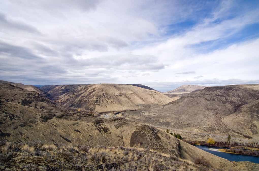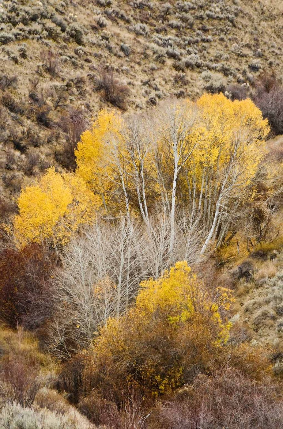 Ethan & I went back to Umtanum Canyon again today, but instead of going up the canyon we took the trail up the first side canyon to the left (south). When we reached the aspen grove with the spring & stock tank near the head of the canyon we took the left fork of the trail that follows the old service road up around Pt 2017 and then south along the bench above the Yakima River. We walked as far as Pt 2016, where we found a nice overlook for lunch. The point was a little more exposed than the rest of the route and we had a cool breeze as we ate. We were also right on the edge of the clouds and sat mostly in the shade while just across the canyon the slopes were mostly in the sun. We had nice views, but the light was a little flat to make it very dramatic. About the time we were ready to start back a train went by below us. Ethan counted 113 cars. The only wildlife we saw was a couple of bald eagles in the Yakima Canyon, but there was still a little fall color hanging on in places. There were quite a few cars in the parking lot, but there were only two other people on our route.