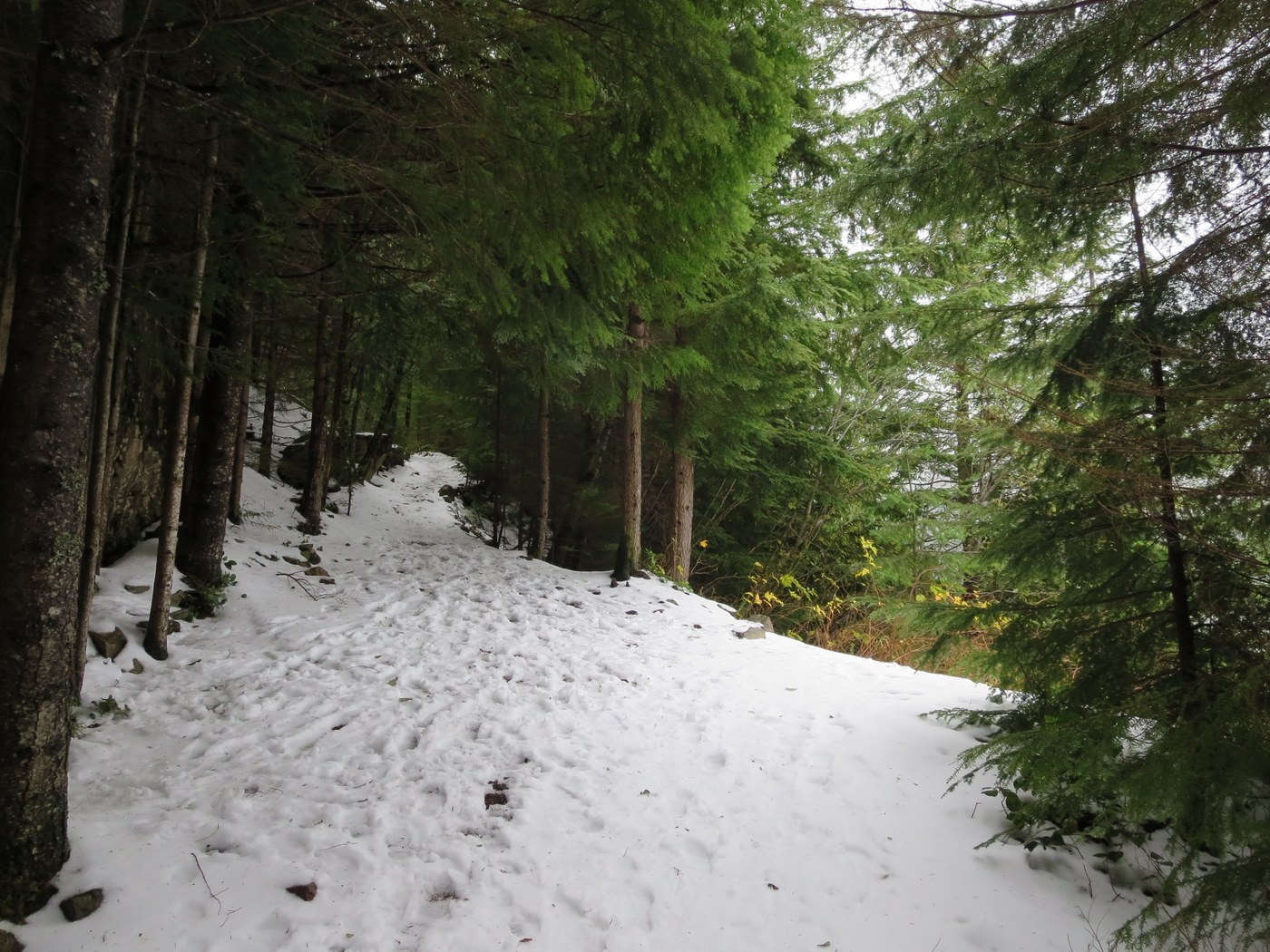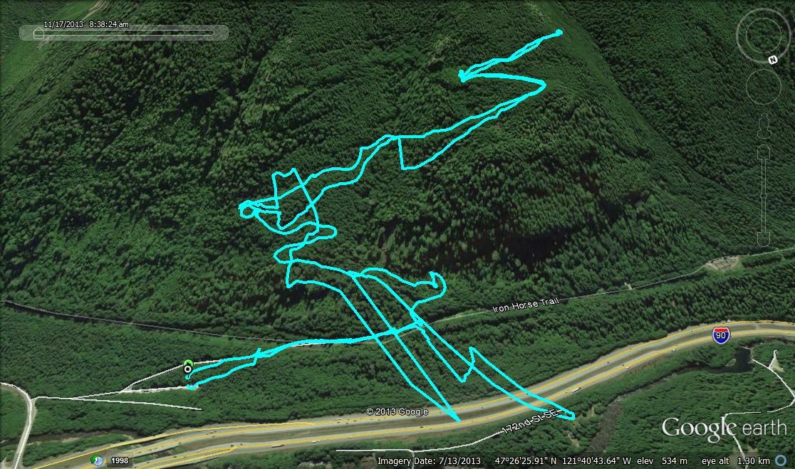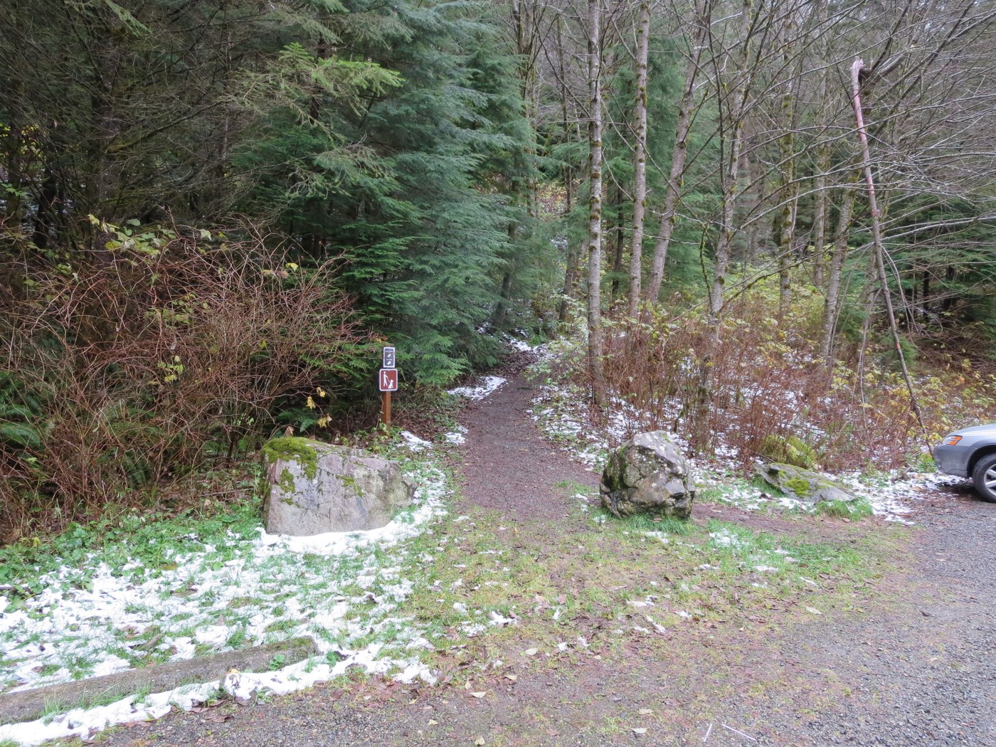 Patchy snow begins at an elevation of 1,487 feet, 0.51 mile from the trailhead. One downed tree between the Iron Horse Trail/Mount Washington Trail junction and the junction with the unidentified trail at 1.80 miles, easily negotiable. Two cars in the parking area upon arrival and seven upon departure. Round-trip hiking time of 2 hours, 32 minutes (8:37 to 11:09 a.m.).