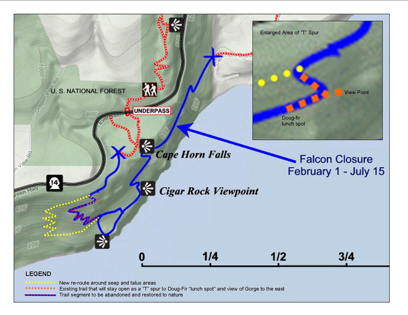 During the planning process that occurred mostly in 2009, WTA, Friends of the Gorge and the Cape Horn Conservancy advocated vigorously for keeping viewpoints available. While the original Forest Service design would have moved entirely away from the cliff south of Hwy 14 - we were able to convince them to retain two popular spots with a "T" spur. (see map)