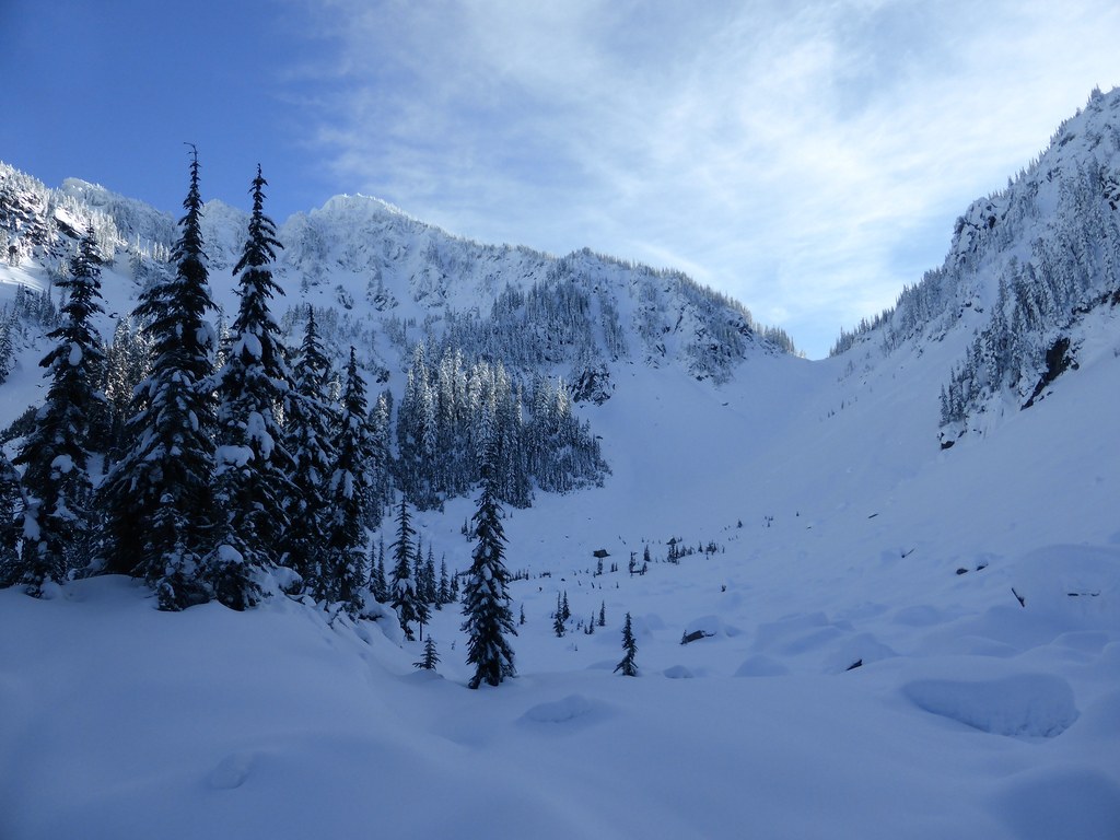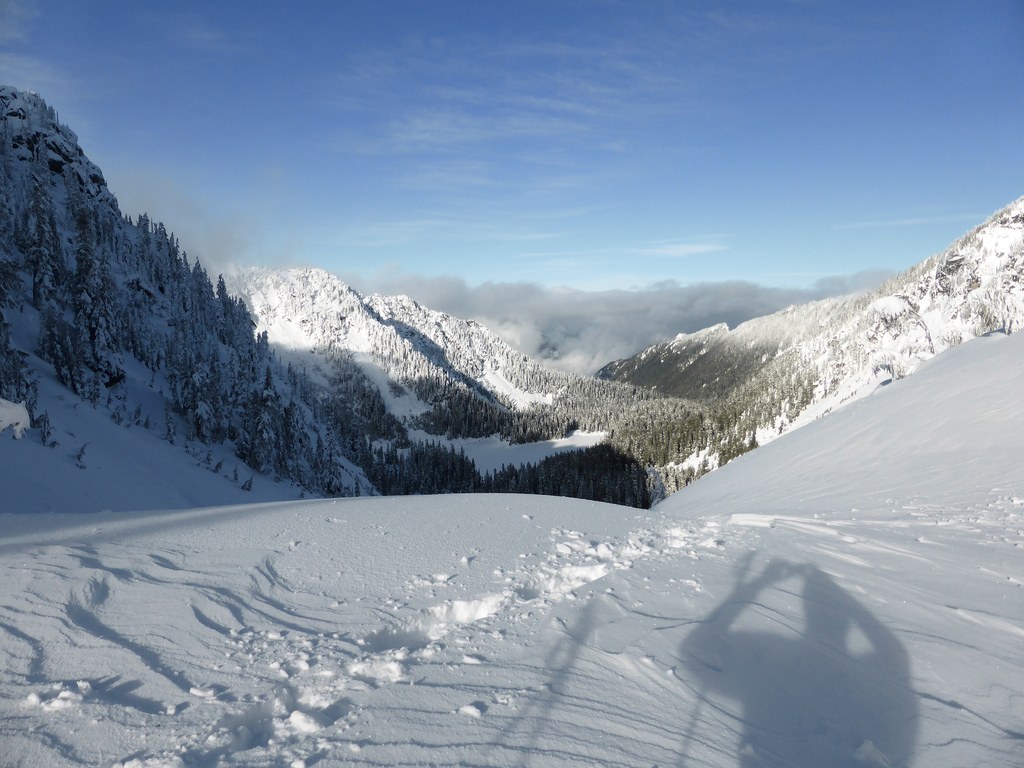 - After Surprise Lake, there were no indications that other people have been in the area. Breaking trail was not too bad though: under the trees there is a solid crust, and in the open area there is ~0.5-1 foot of powder snow on top of a very solid crust. Overall quite pleasant.