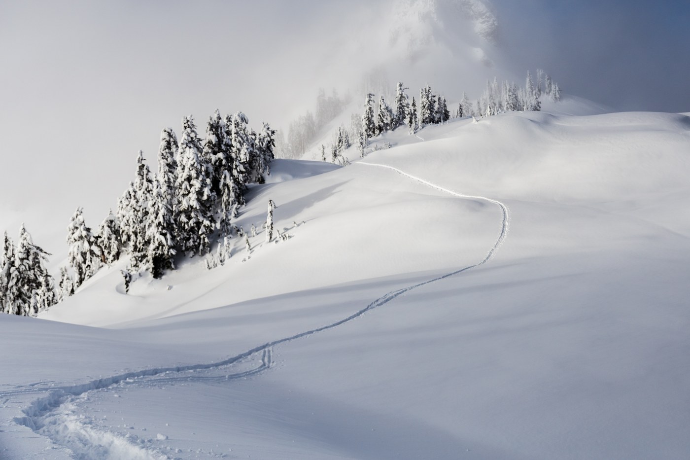 I was fortunate to get a relatively early start after my 3 hour drive from Kirkland, leaving the ski area parking for the trail before noon. There were already many sets of tracks; if your destination is Artist Point or Ptarmigan Ridge, you set out in the same direction -- follow the right (western) boundary of the ski area up, sometimes steeply, until you leave it behind.