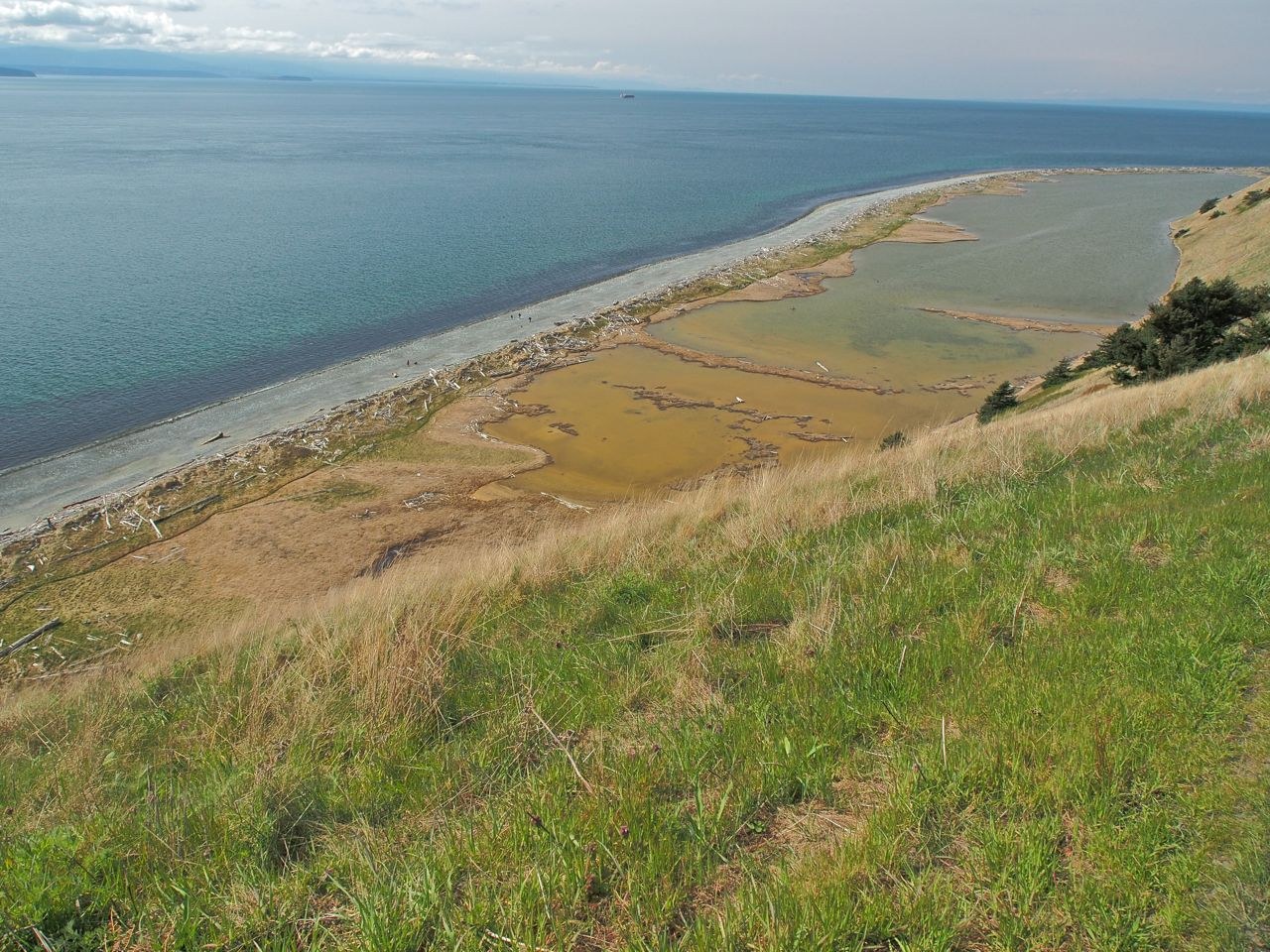 We began our hike at the Prairie Overlook TH. The day was sunny, clouds were hiding the Olympics, and there was a light wind which was cold as we began our hike but which later in the day felt good as we were warmed by the sun. Rather than hiking the beach to make a loop we returned to the TH on the bluff trail so we could again enjoy the beauty of the bluff and the activity in the waters below. We saw a few eagles soaring above. Oregon grape, popcorn flowers, yellow desert parsley, prairie stars, and early blue violets were flowers seen along the bluff trail. Many filaree, a few grape hyacinths, and a flower we haven't yet identified were growing in the homestead lawn.